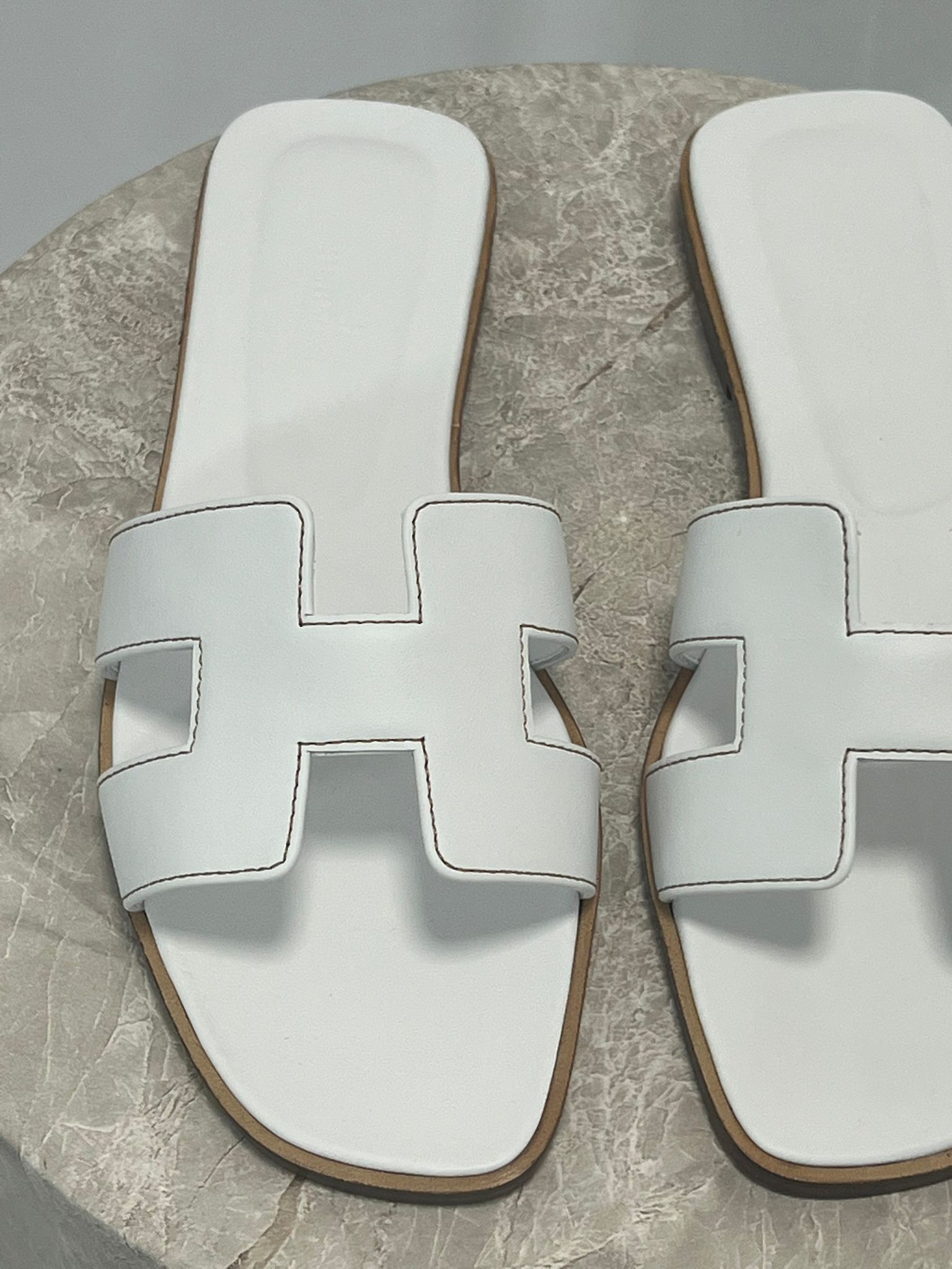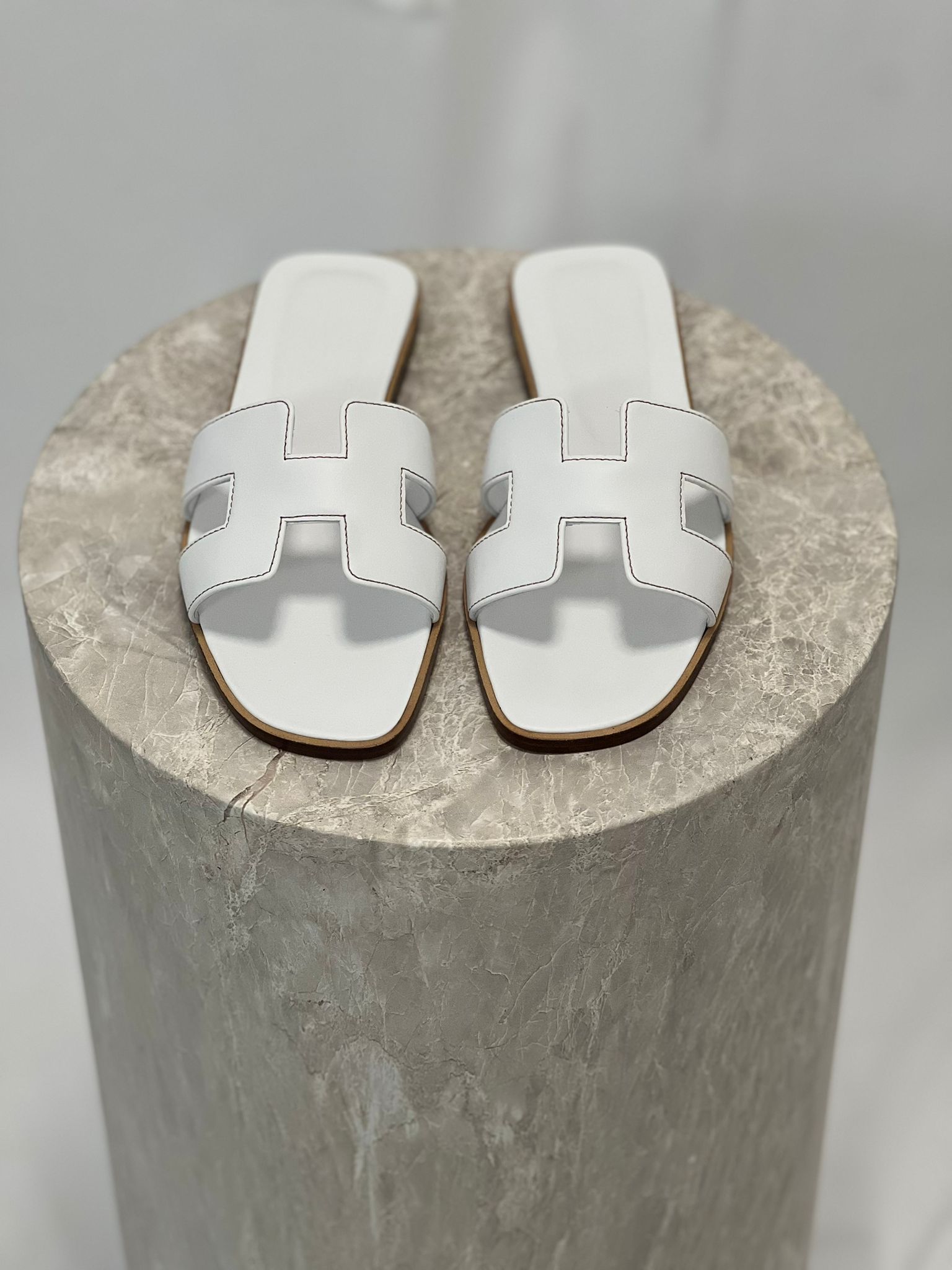 - The Hermès Oran sandals are crafted from premium leather and feature the iconic “H” cut-out design.