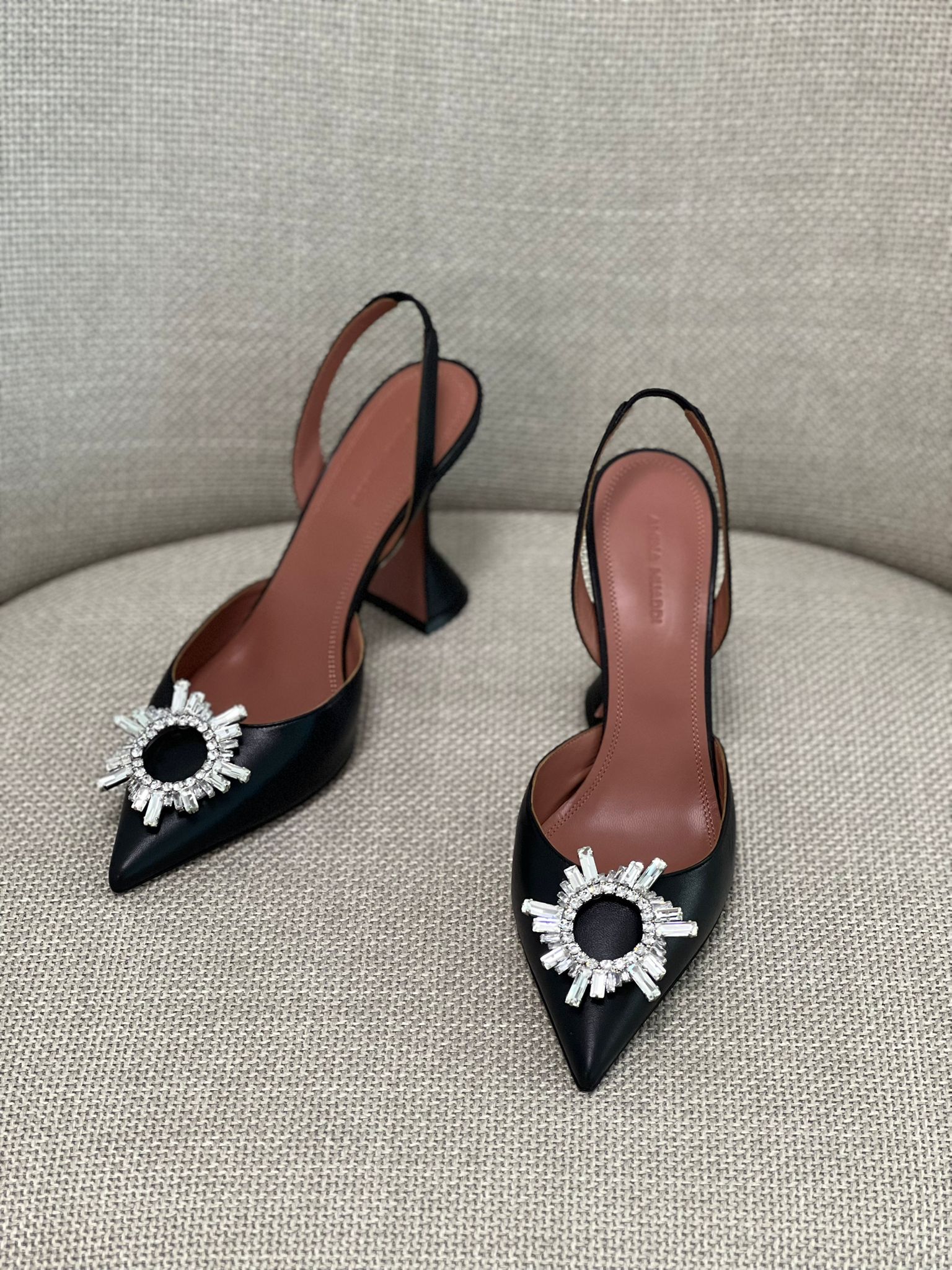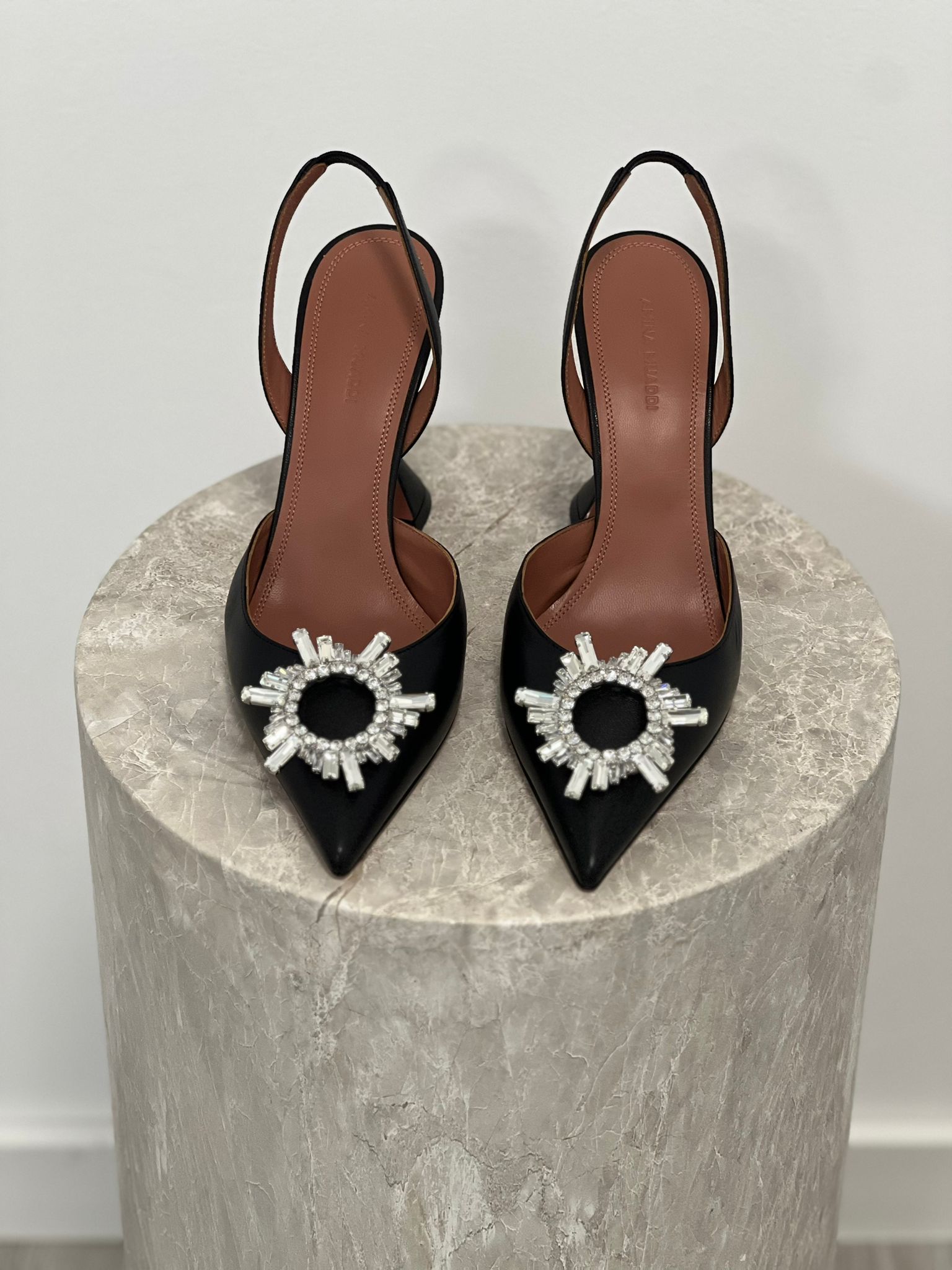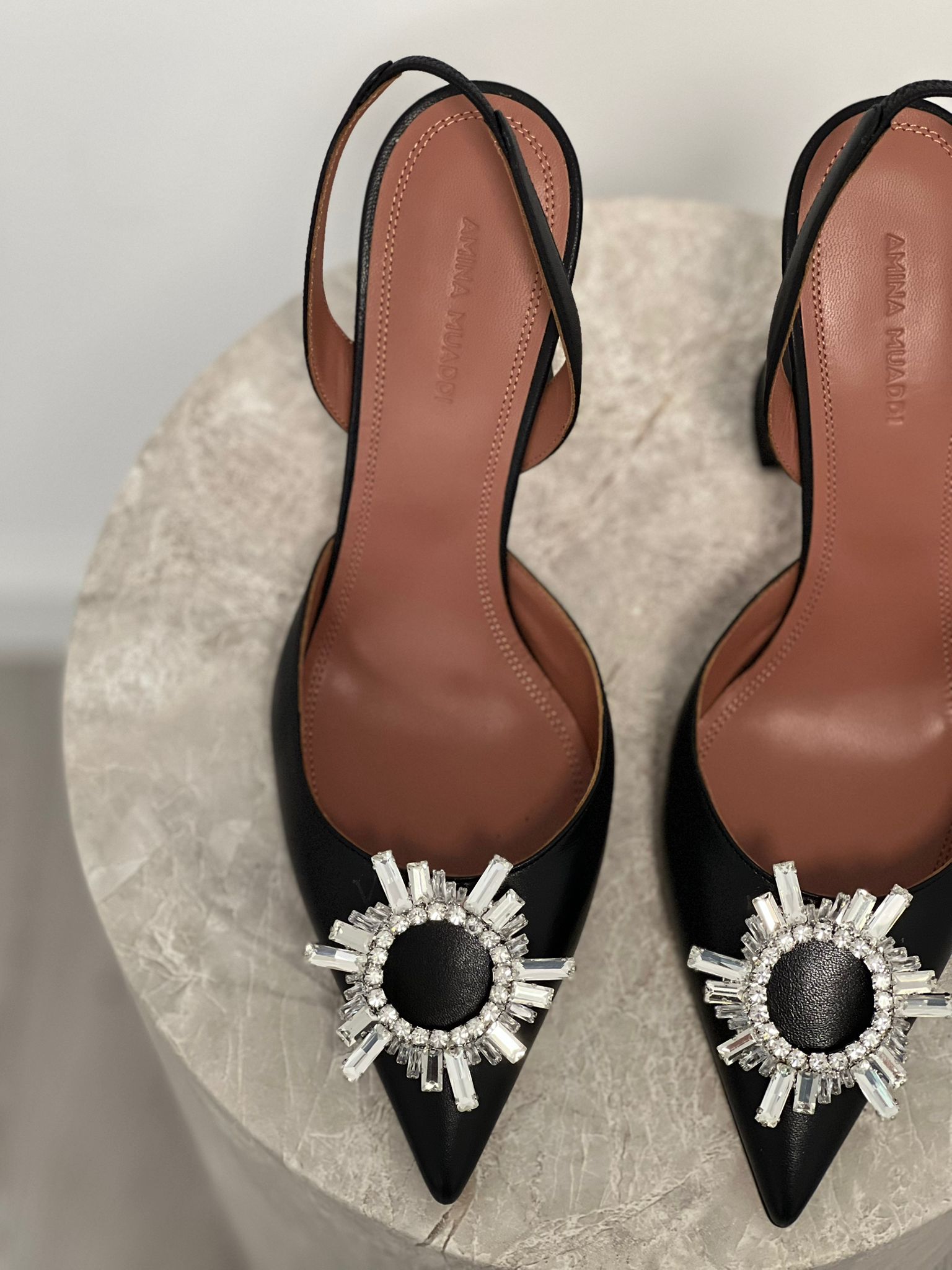 - Amina Muaddi slingback pumps made of genuine leather, featuring a pointed toe adorned with crystals and the brand’s signature flared heel.