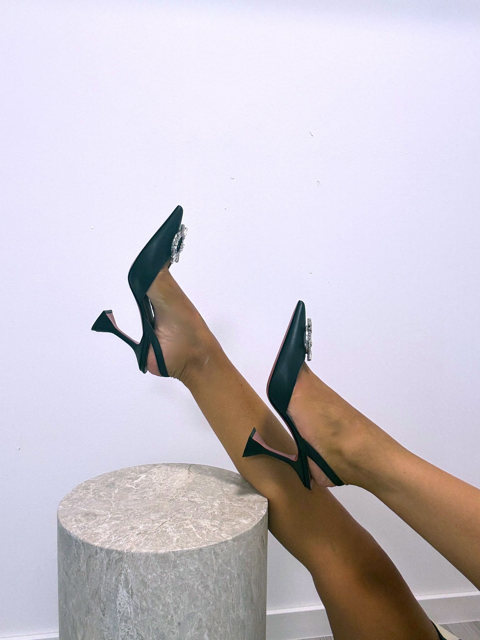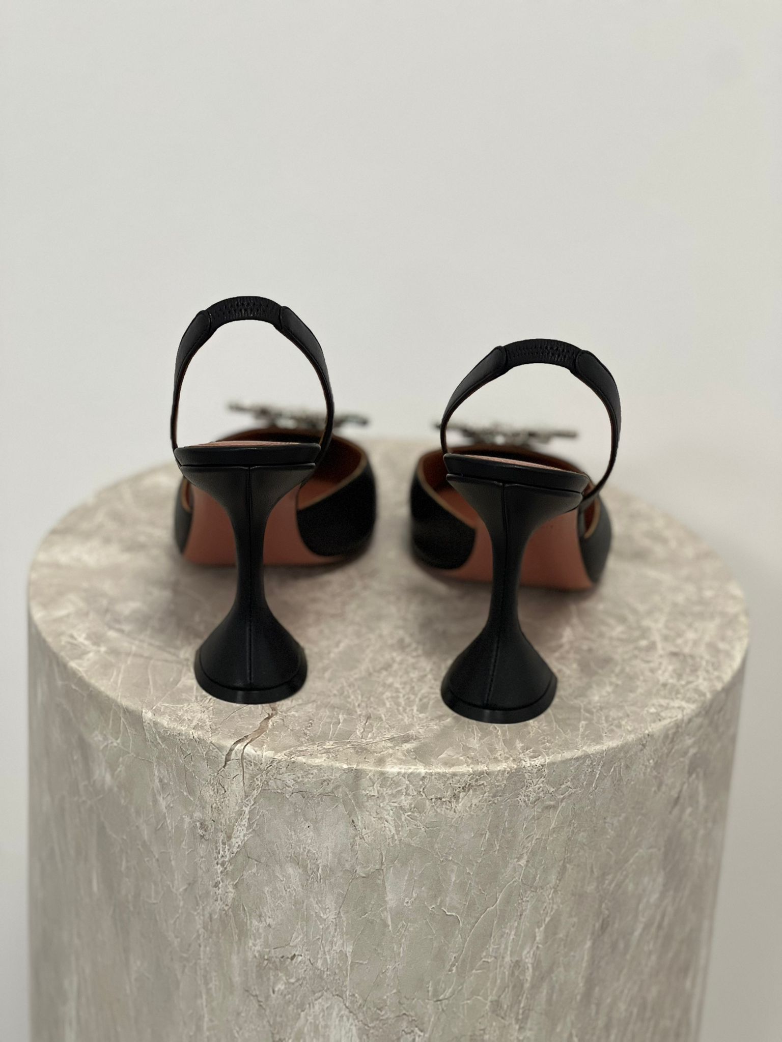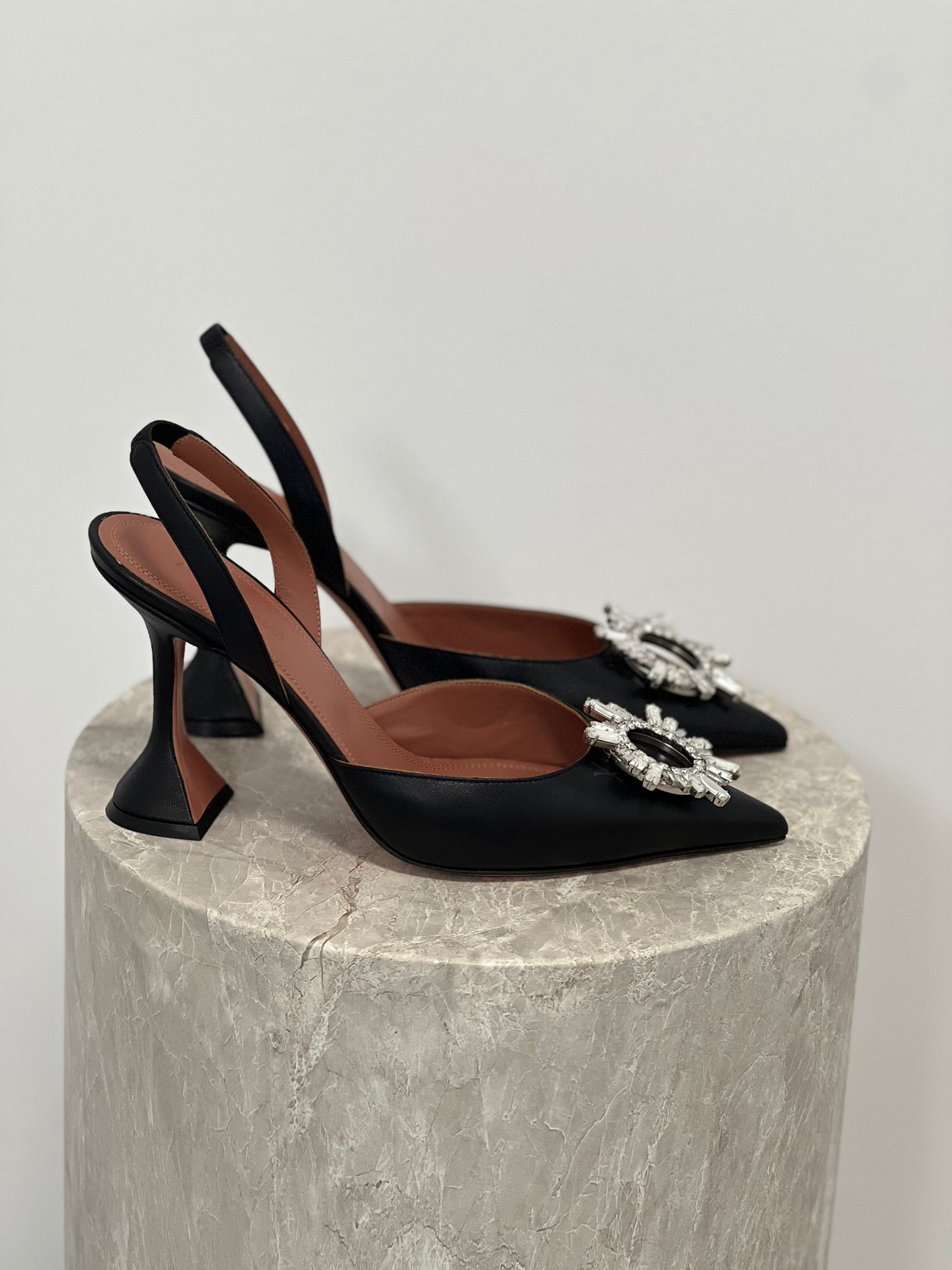 - Amina Muaddi slingback pumps made of genuine leather, featuring a pointed toe adorned with crystals and the brand’s signature flared heel.
