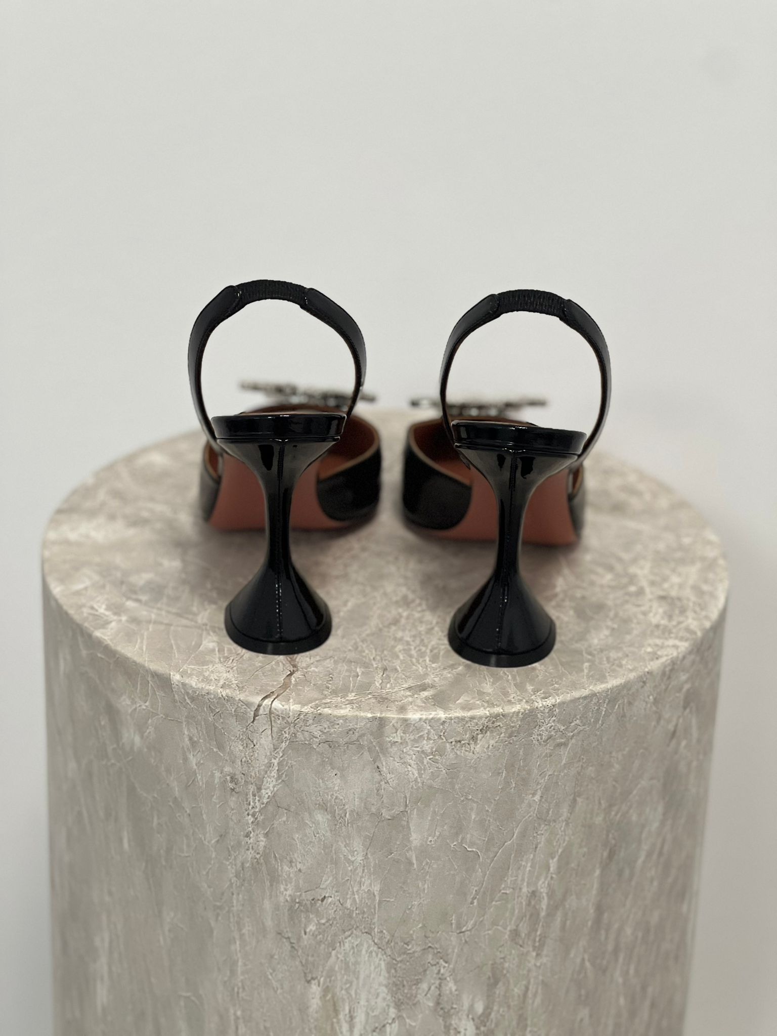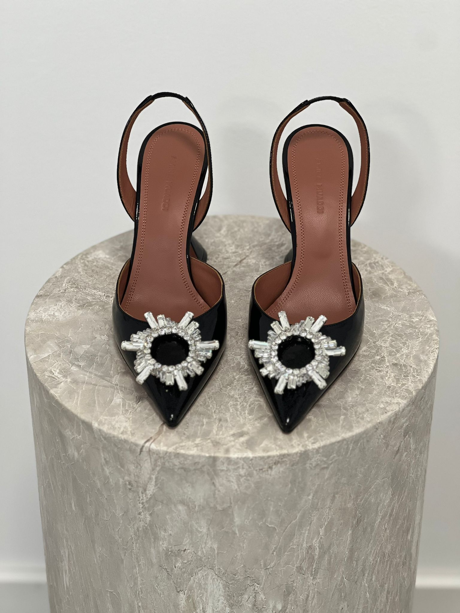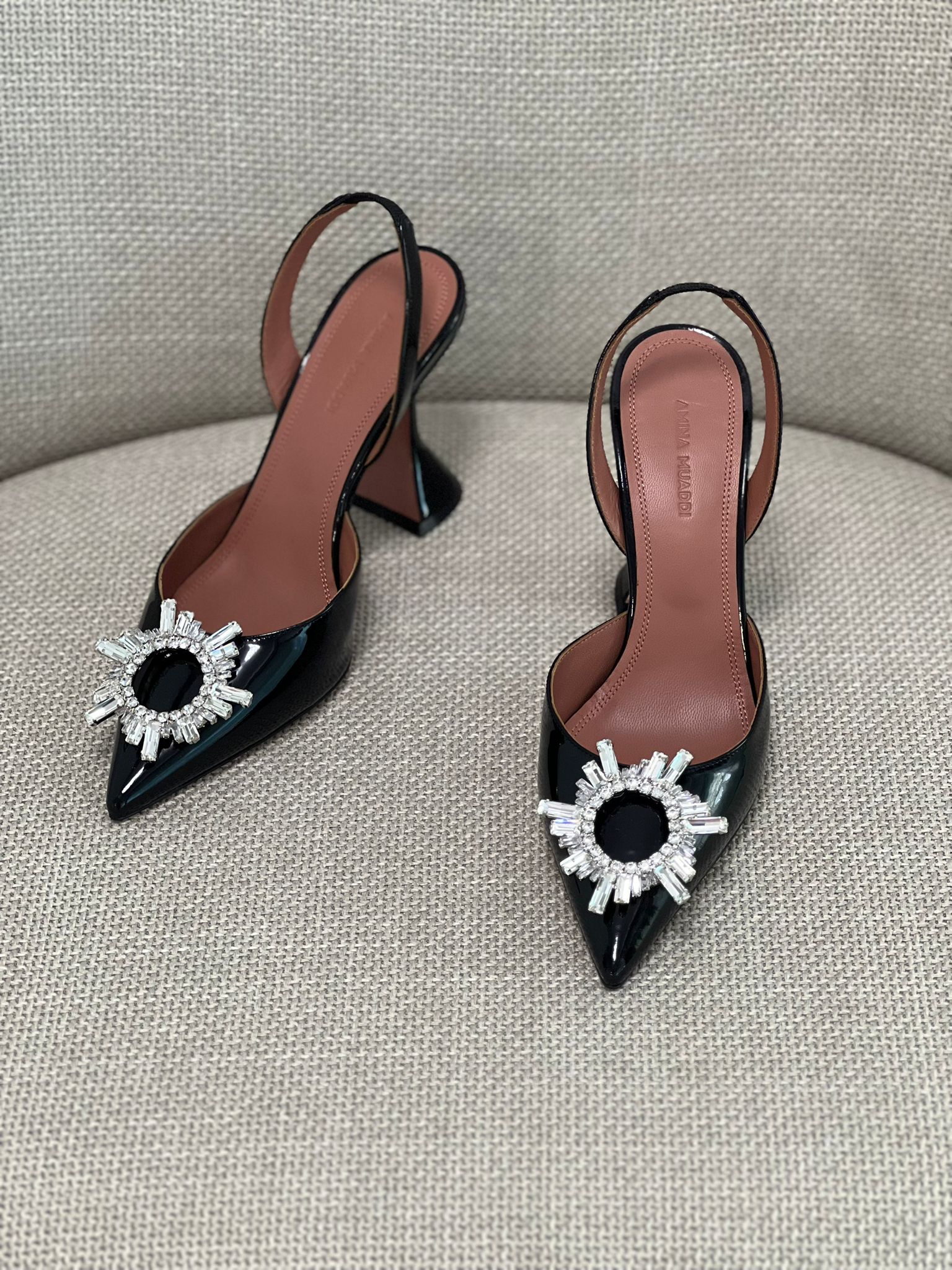 - Amina Muaddi slingback pumps made of genuine patent leather, featuring a pointed toe adorned with crystals and the brand’s signature flared heel.