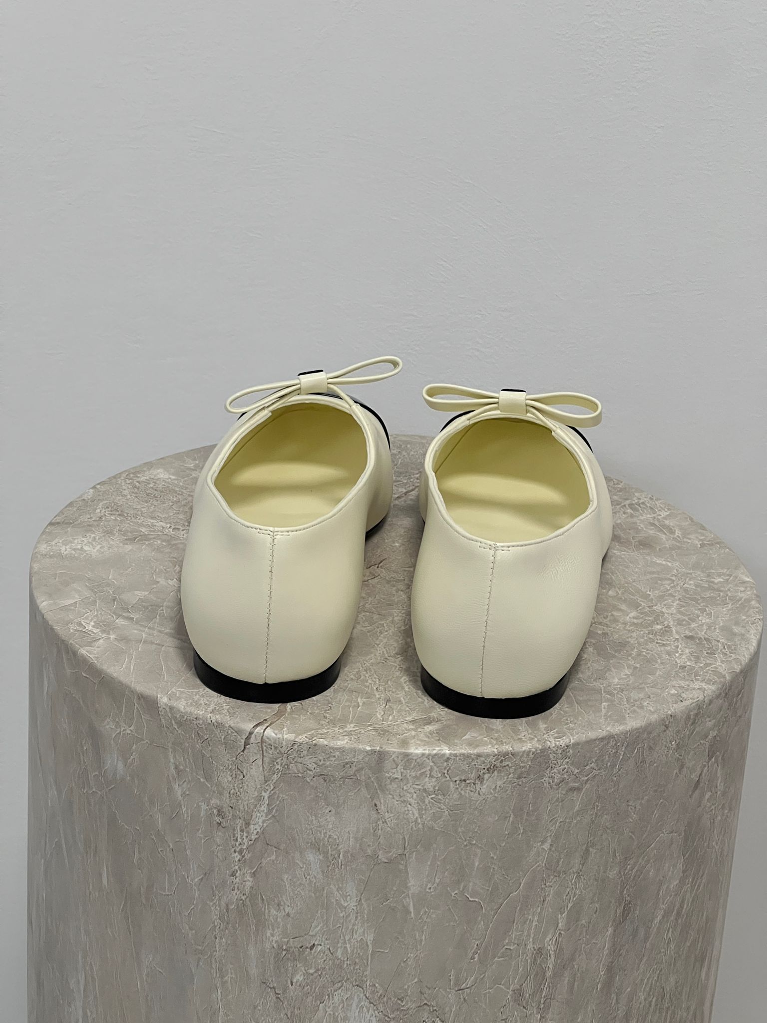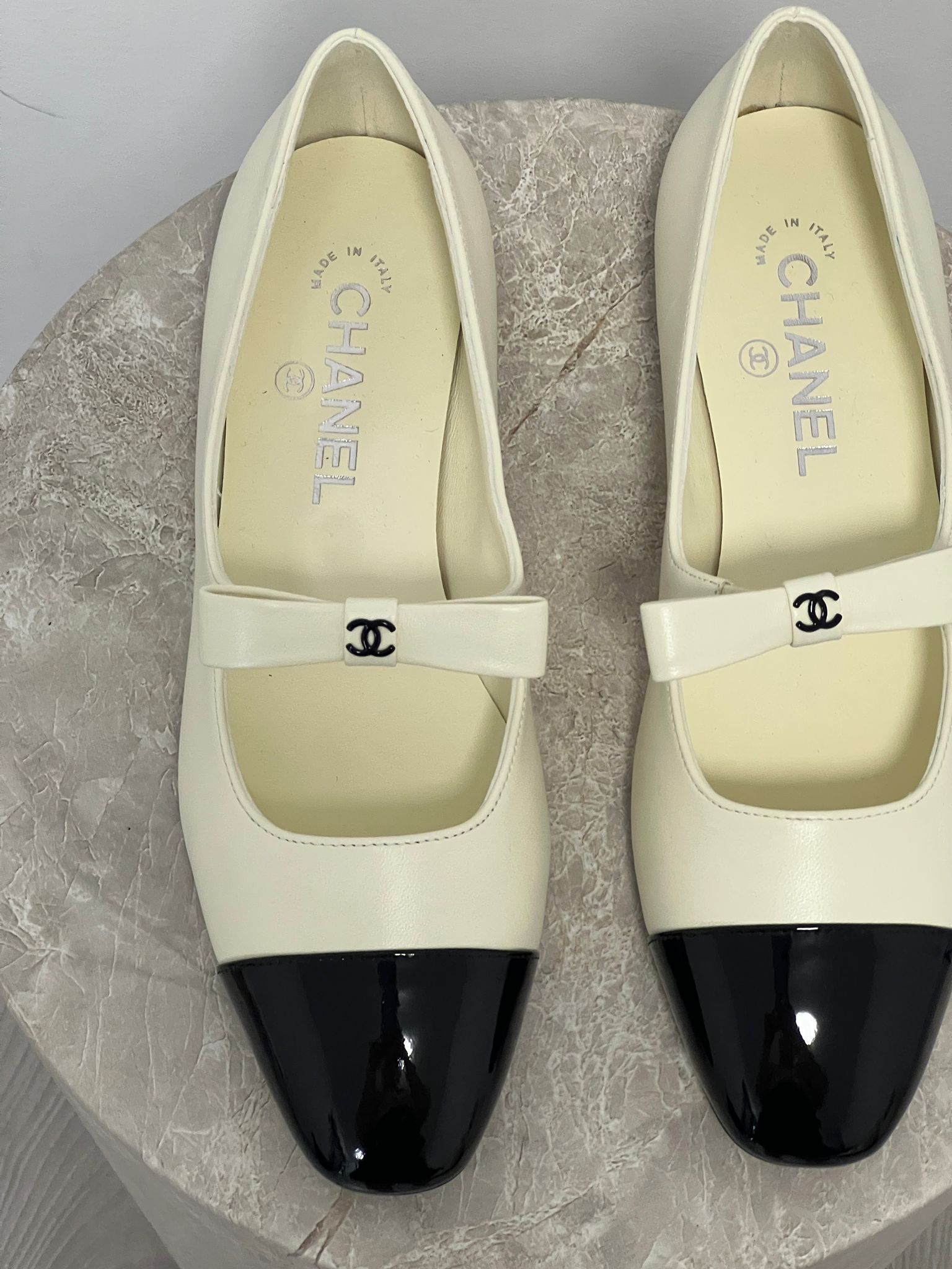 - Timeless and feminine, these CHANEL Mary Jane ballerinas are crafted in smooth leather with the iconic two-tone design – cream body and black patent toe. The delicate strap is adorned with the signature CC logo, adding a refined touch. Elegant yet comfortable, they are perfect for both everyday wear and chic occasions.