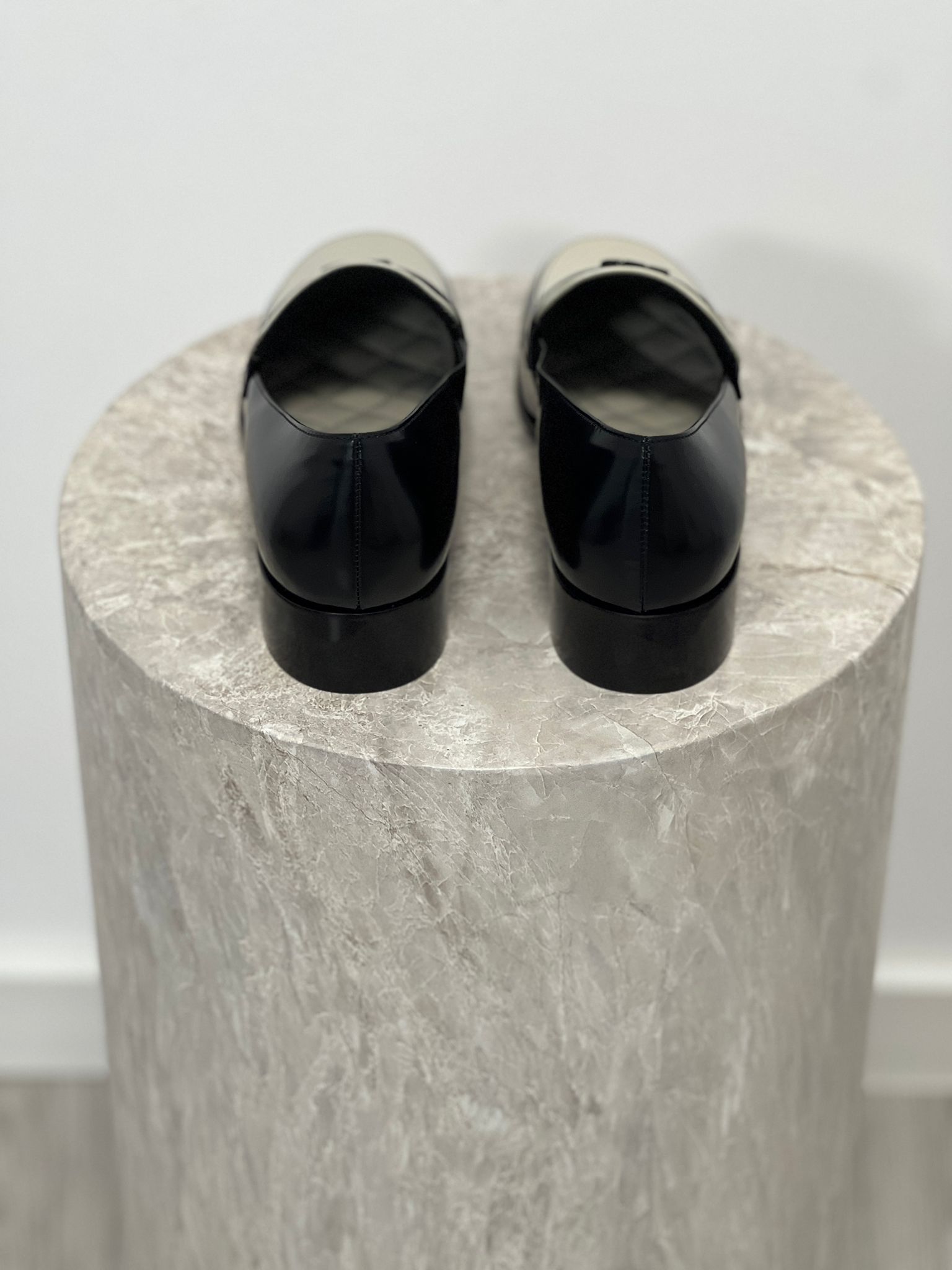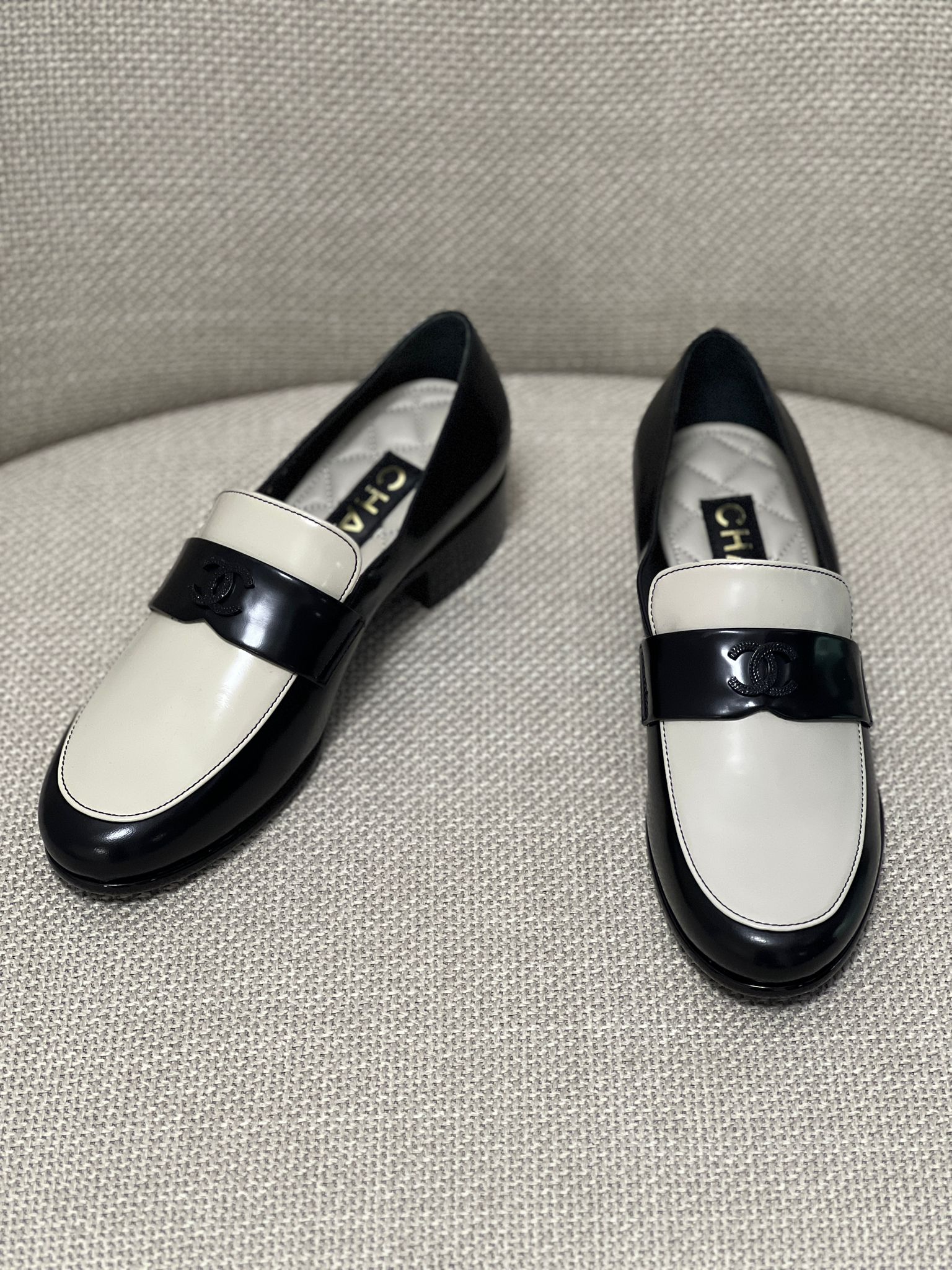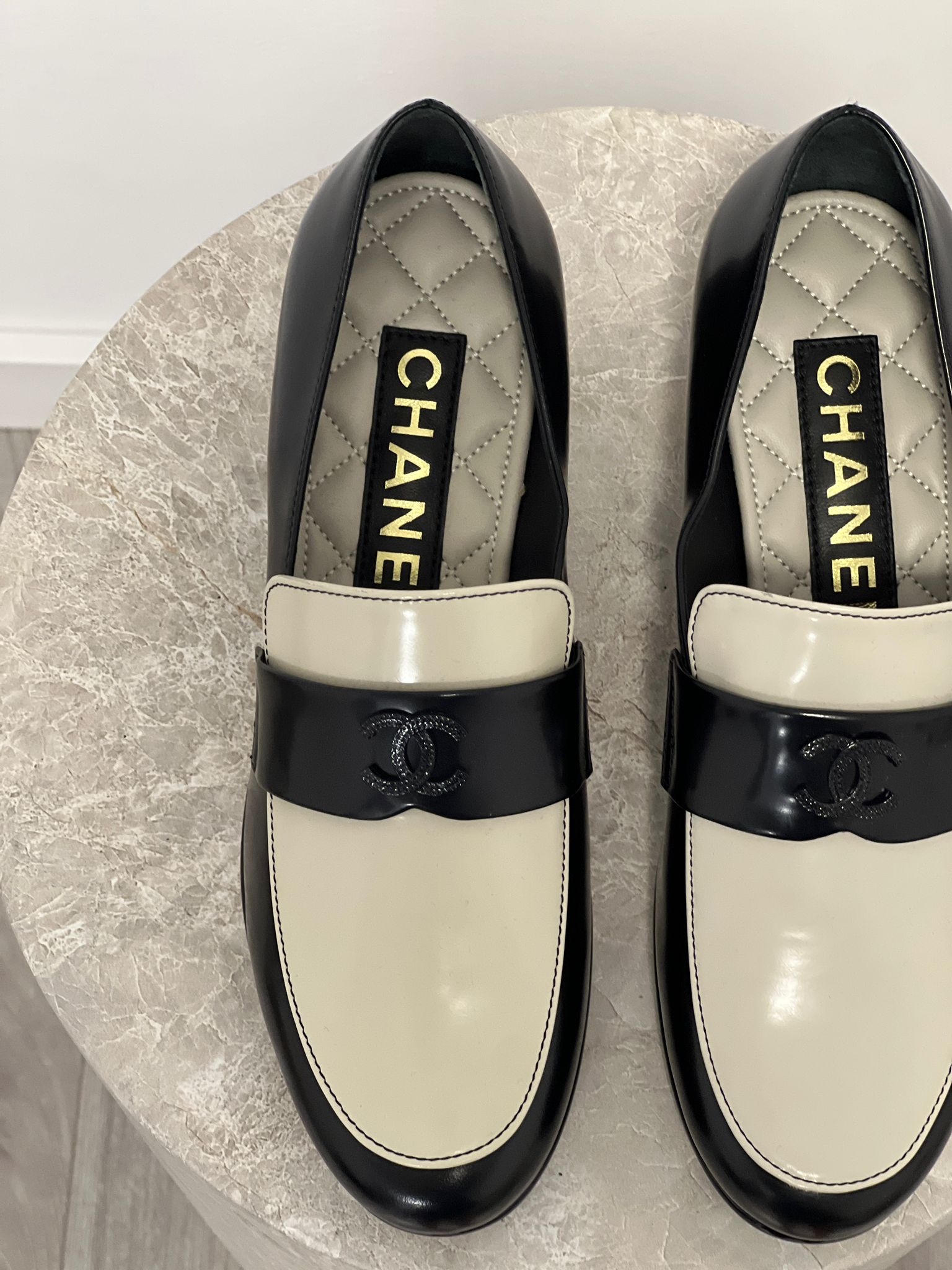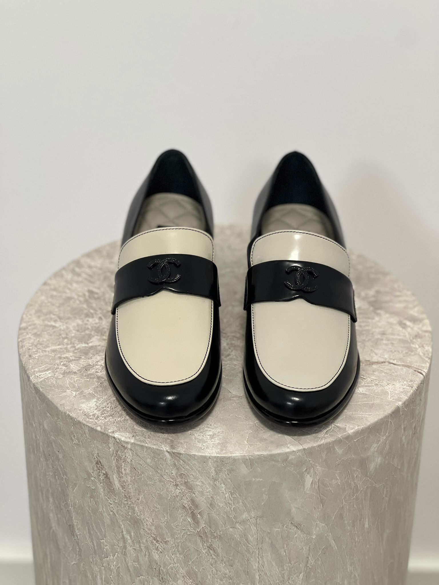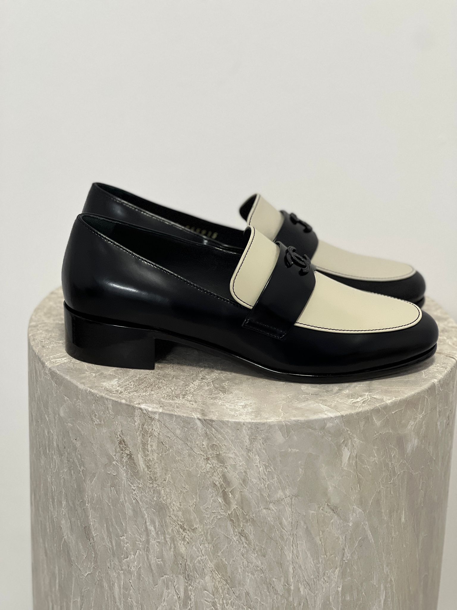 - Chanel loafers in smooth leather, available in black and white, featuring signature detailing.