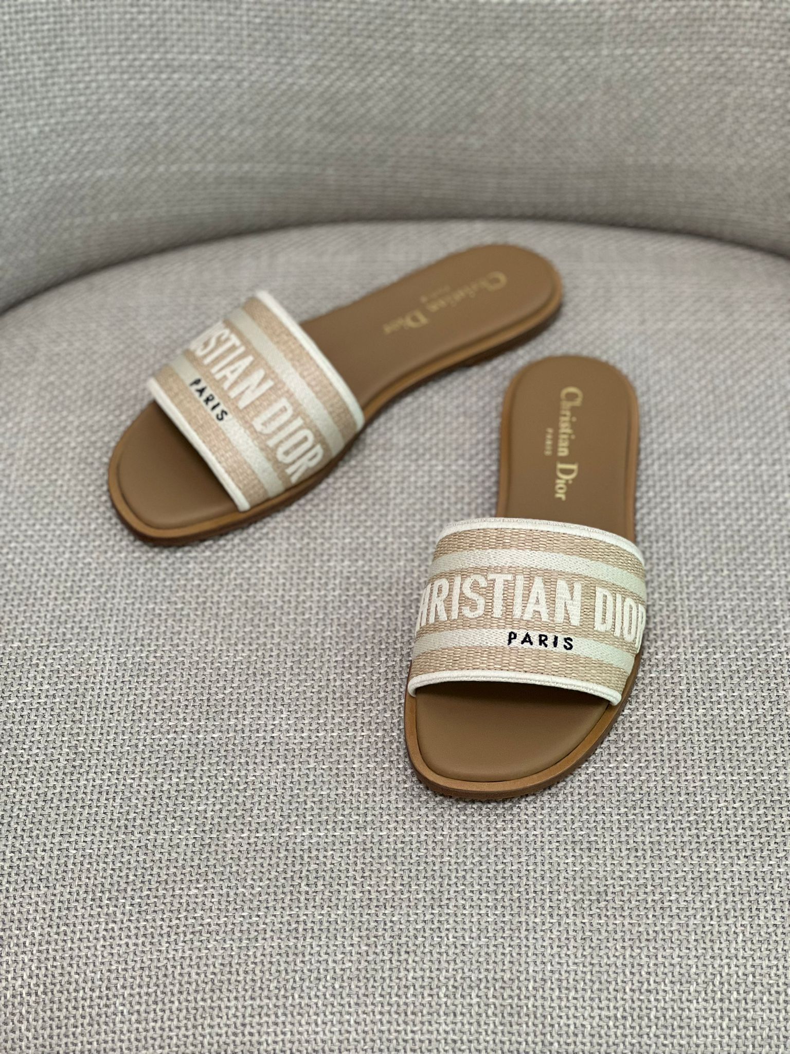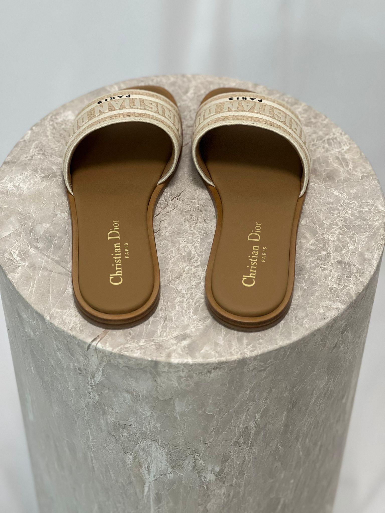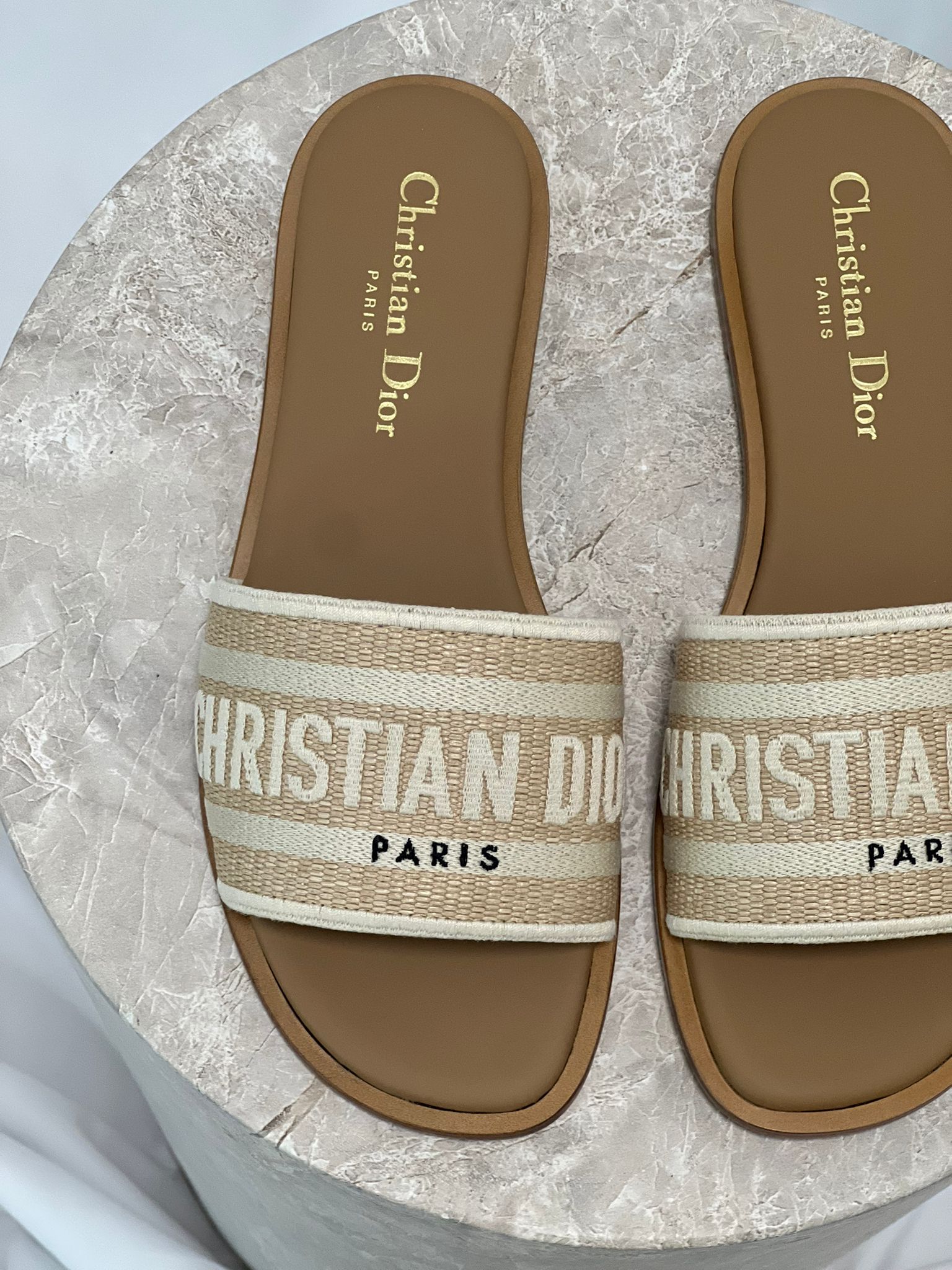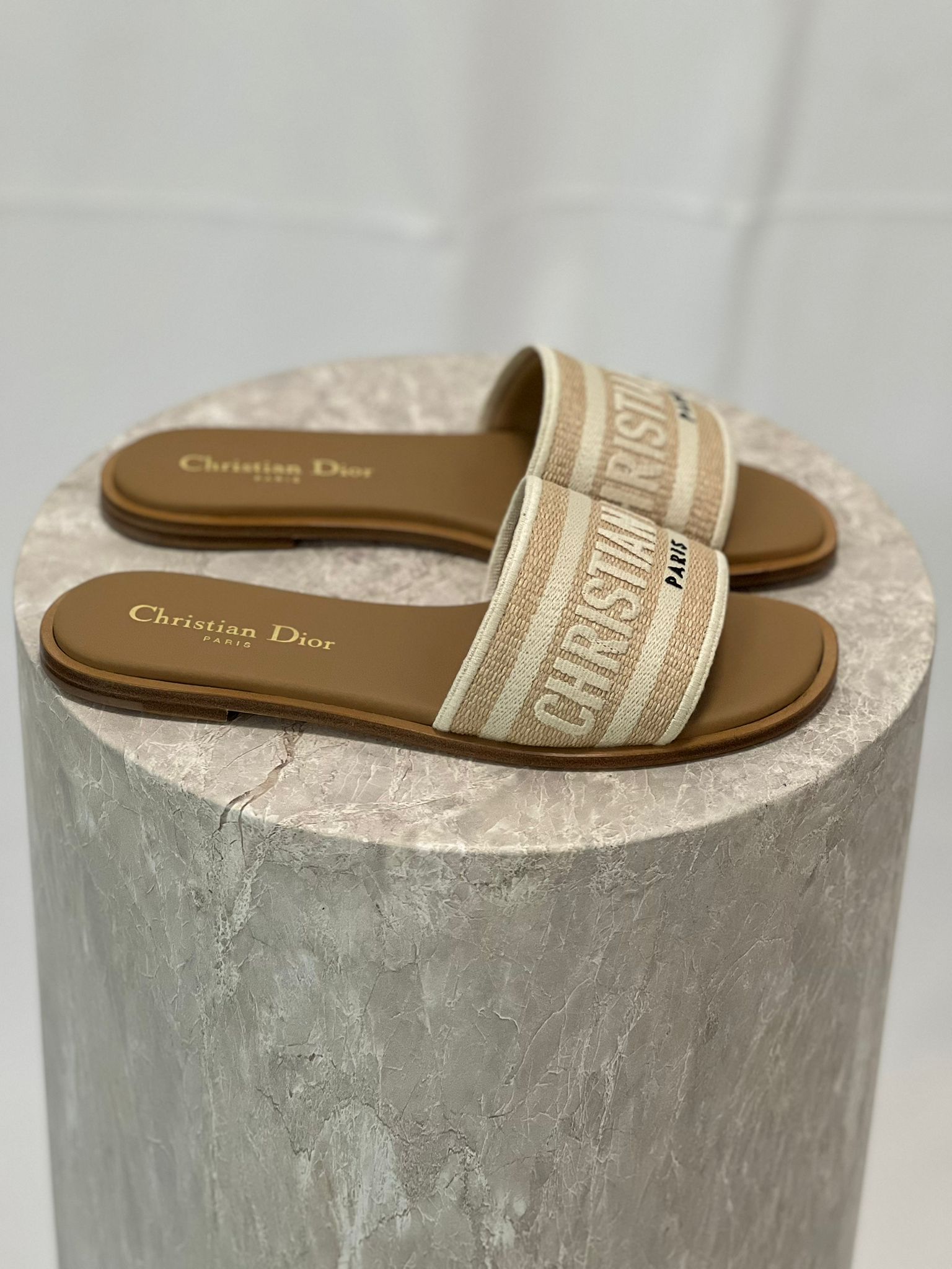 - Made from premium calfskin leather and embroidered cotton, these slip-on slides combine comfort and a chic, relaxed style.