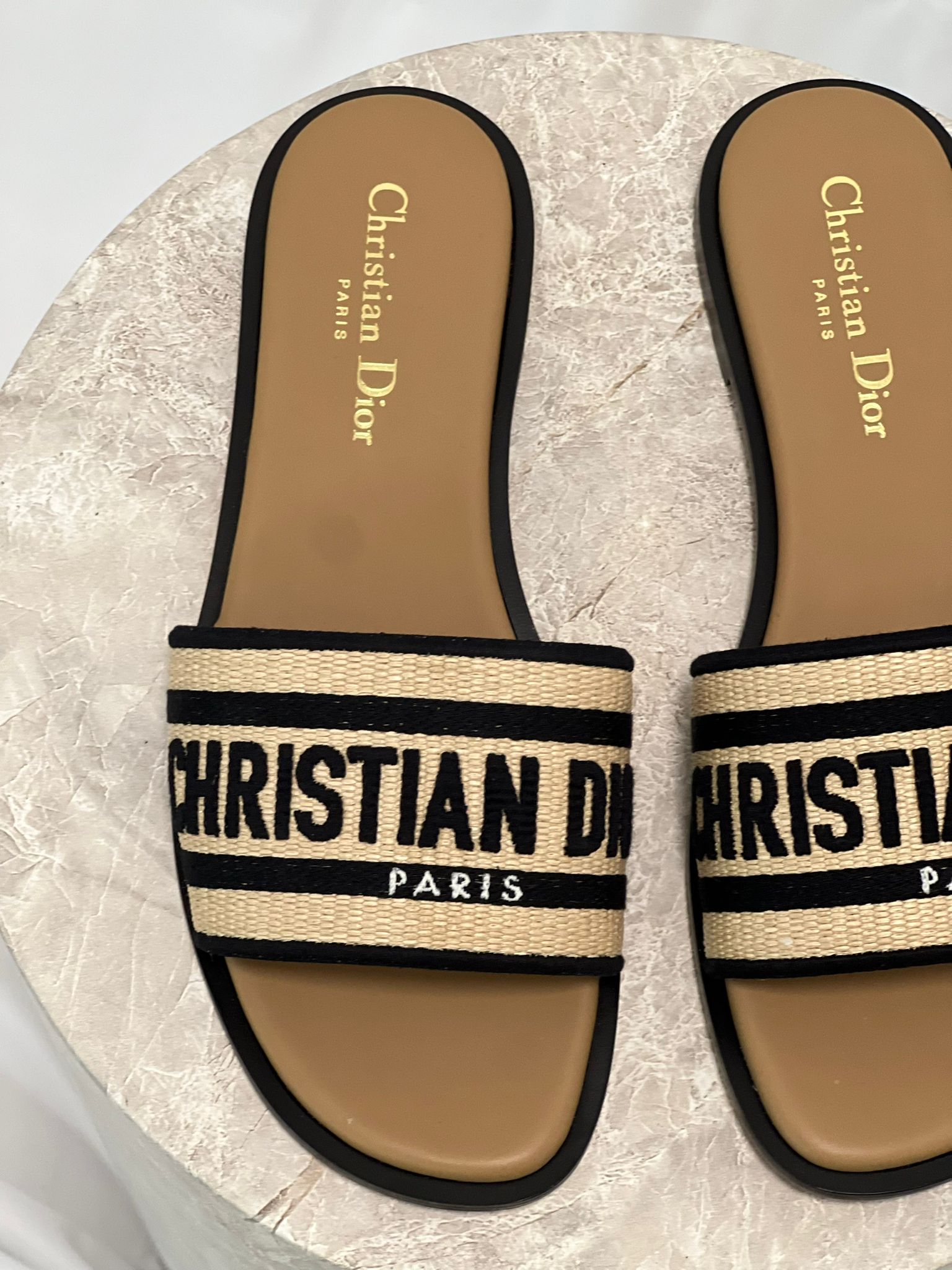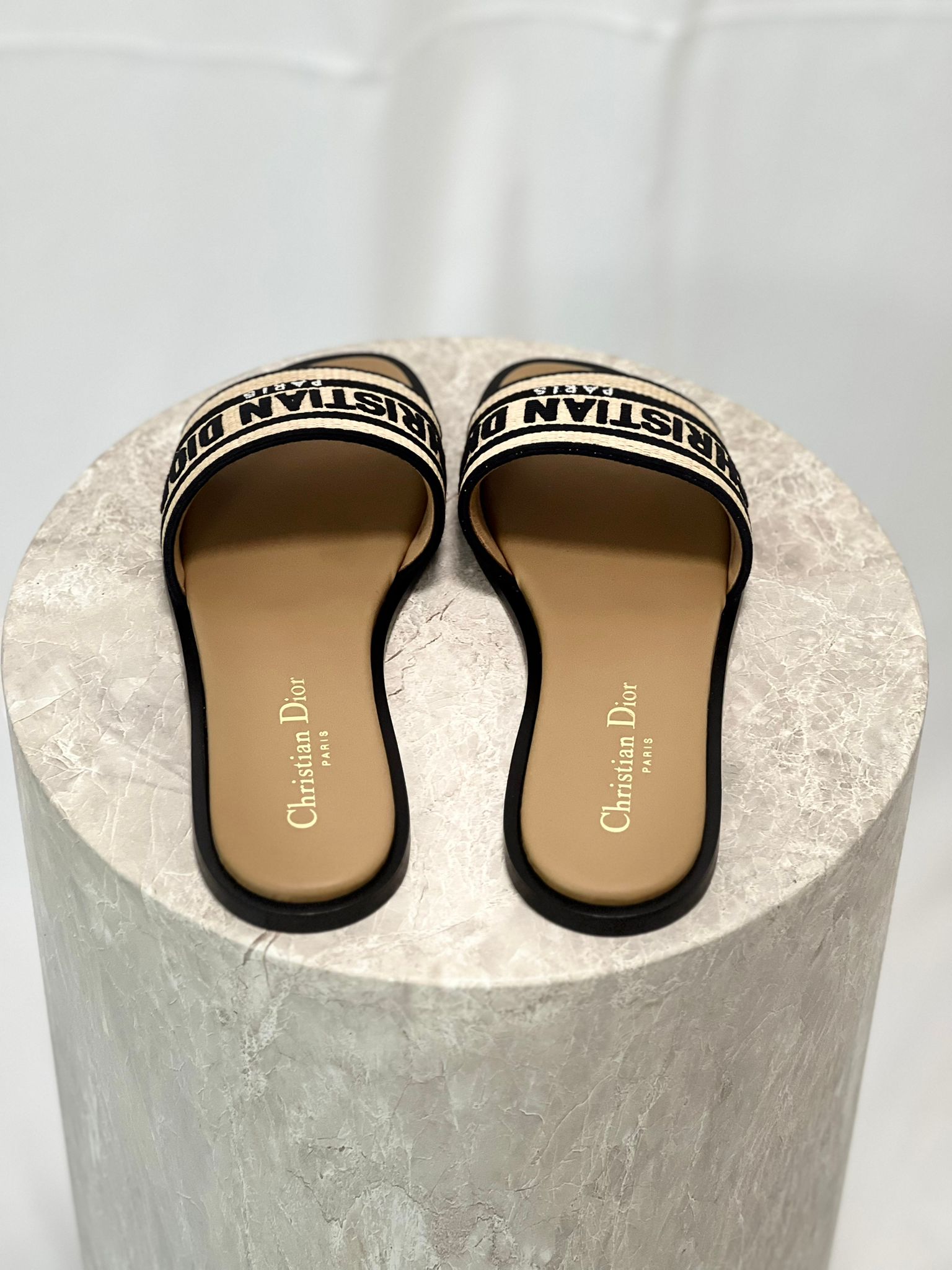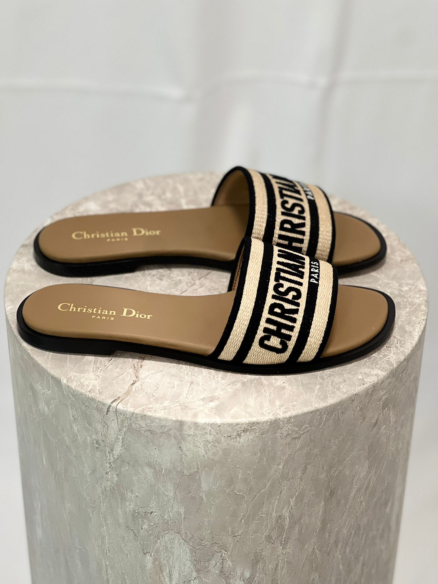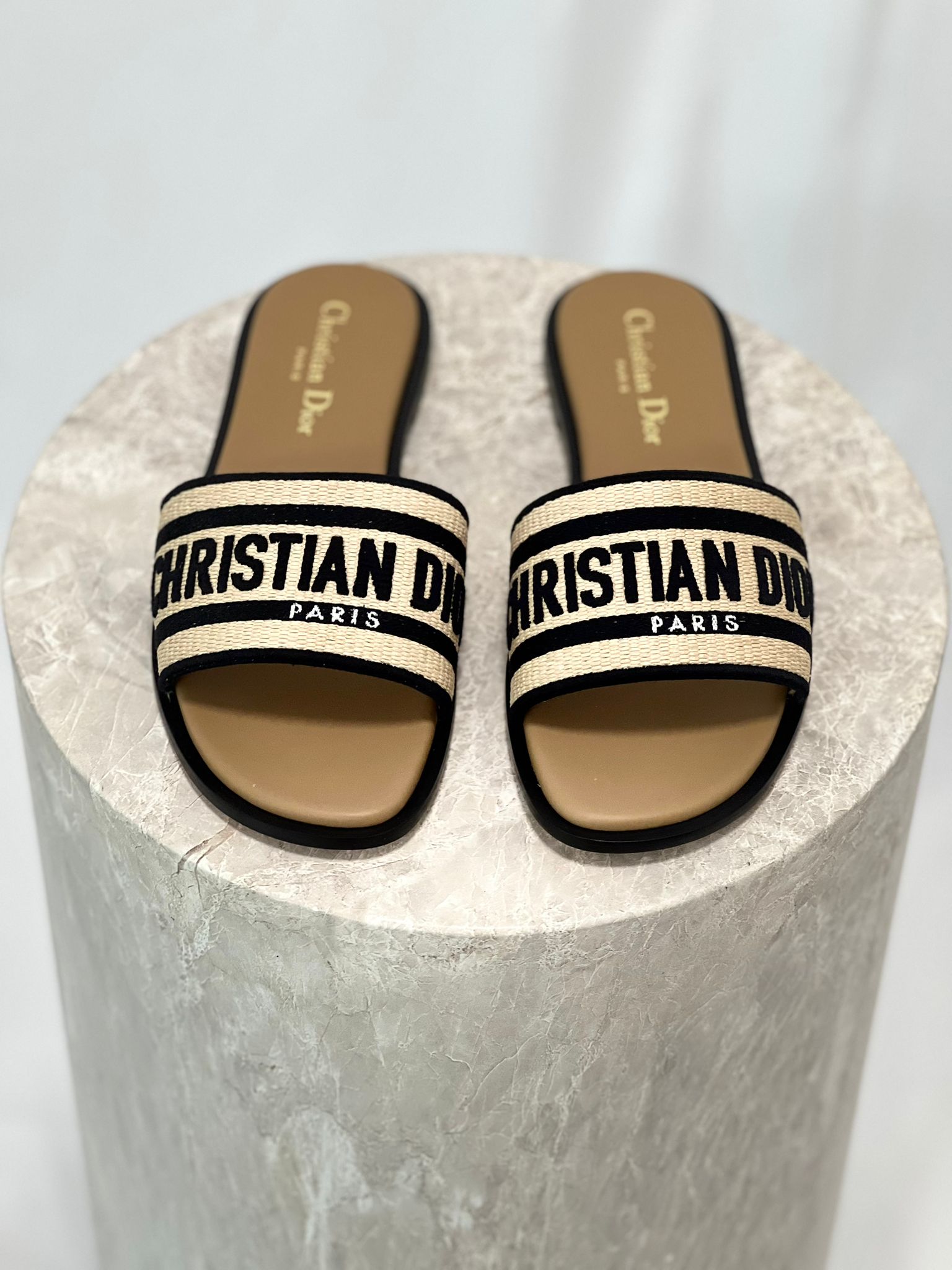 - Made from premium calfskin leather and embroidered cotton, these slip-on slides combine comfort and a chic, relaxed style.