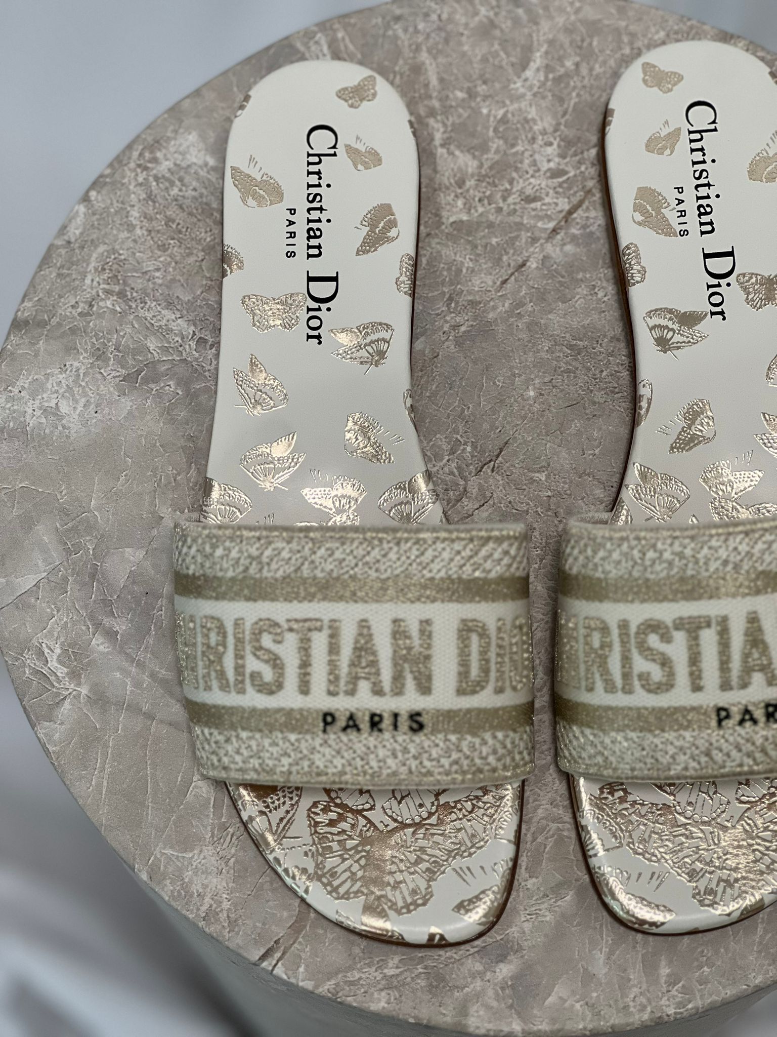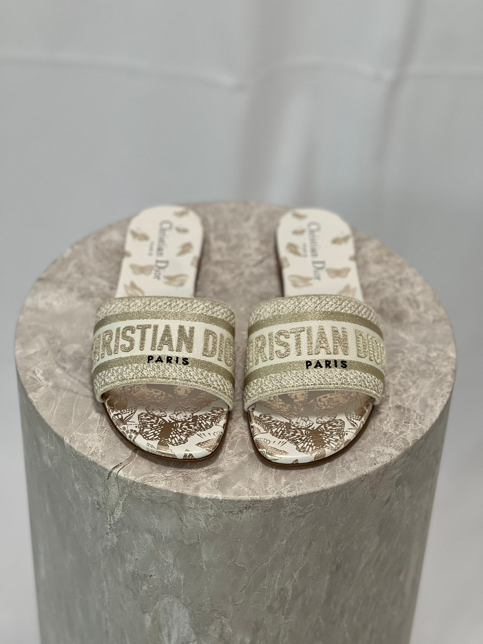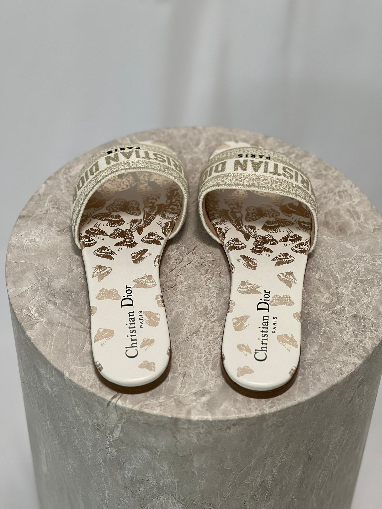 - Made from premium calfskin leather and embroidered cotton, these slip-on slides combine comfort and a chic, relaxed style.