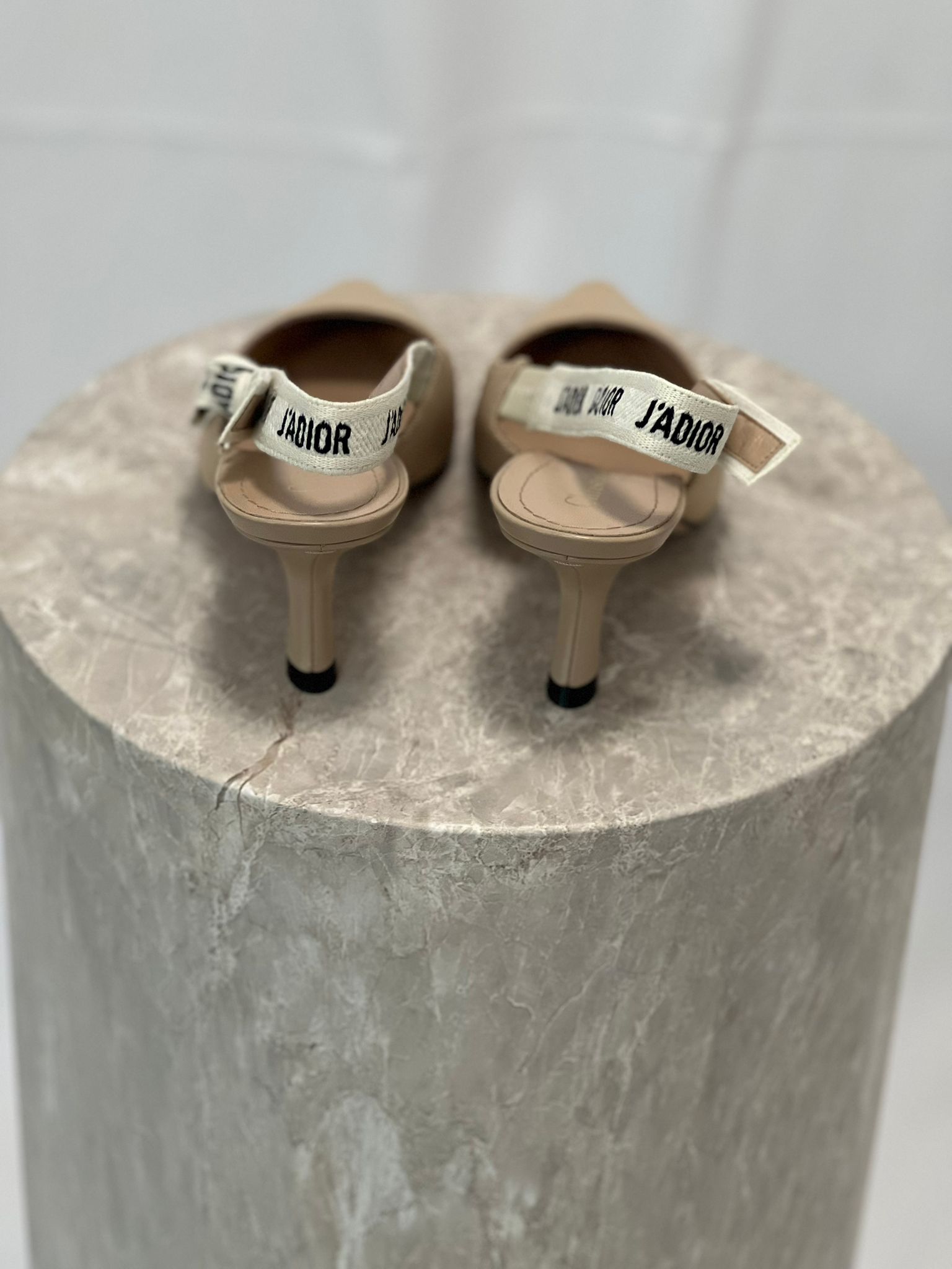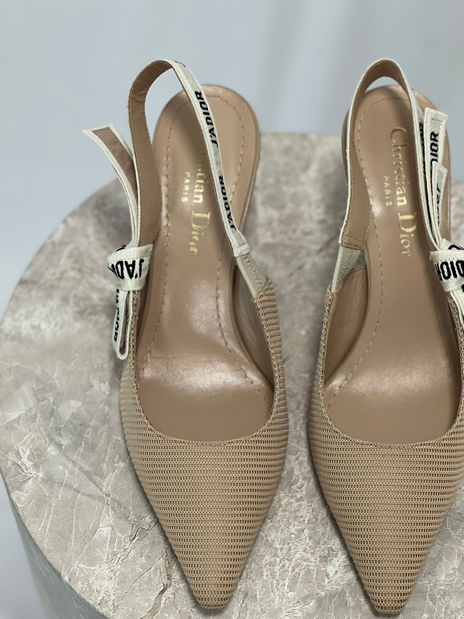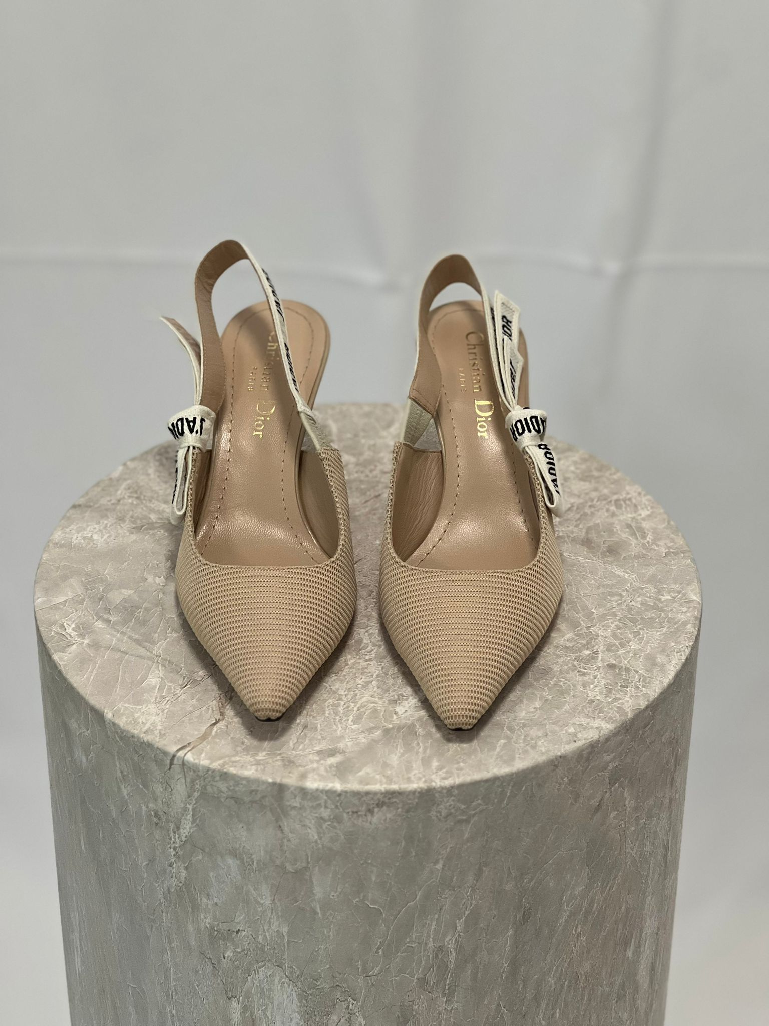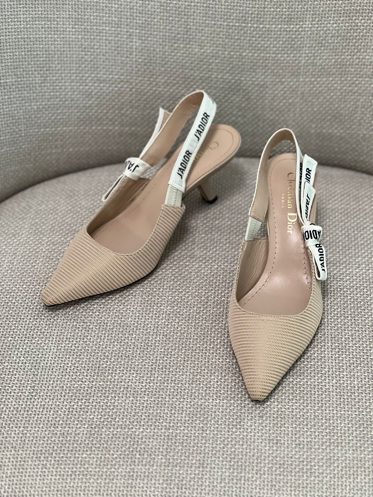 - Elegant slingback pumps in refined fabric, featuring the signature “J’Adior” ribbon, pointed toe, and a sleek 6 cm heel.