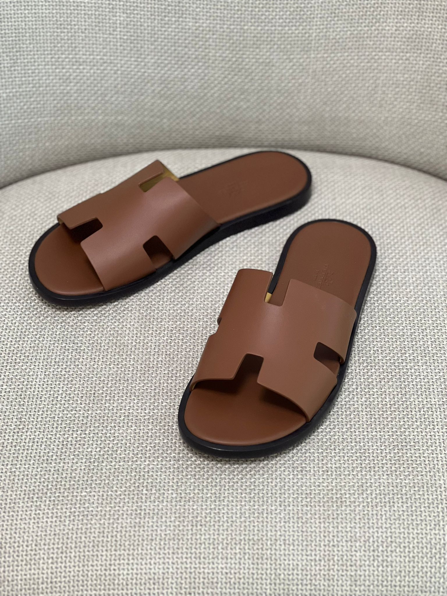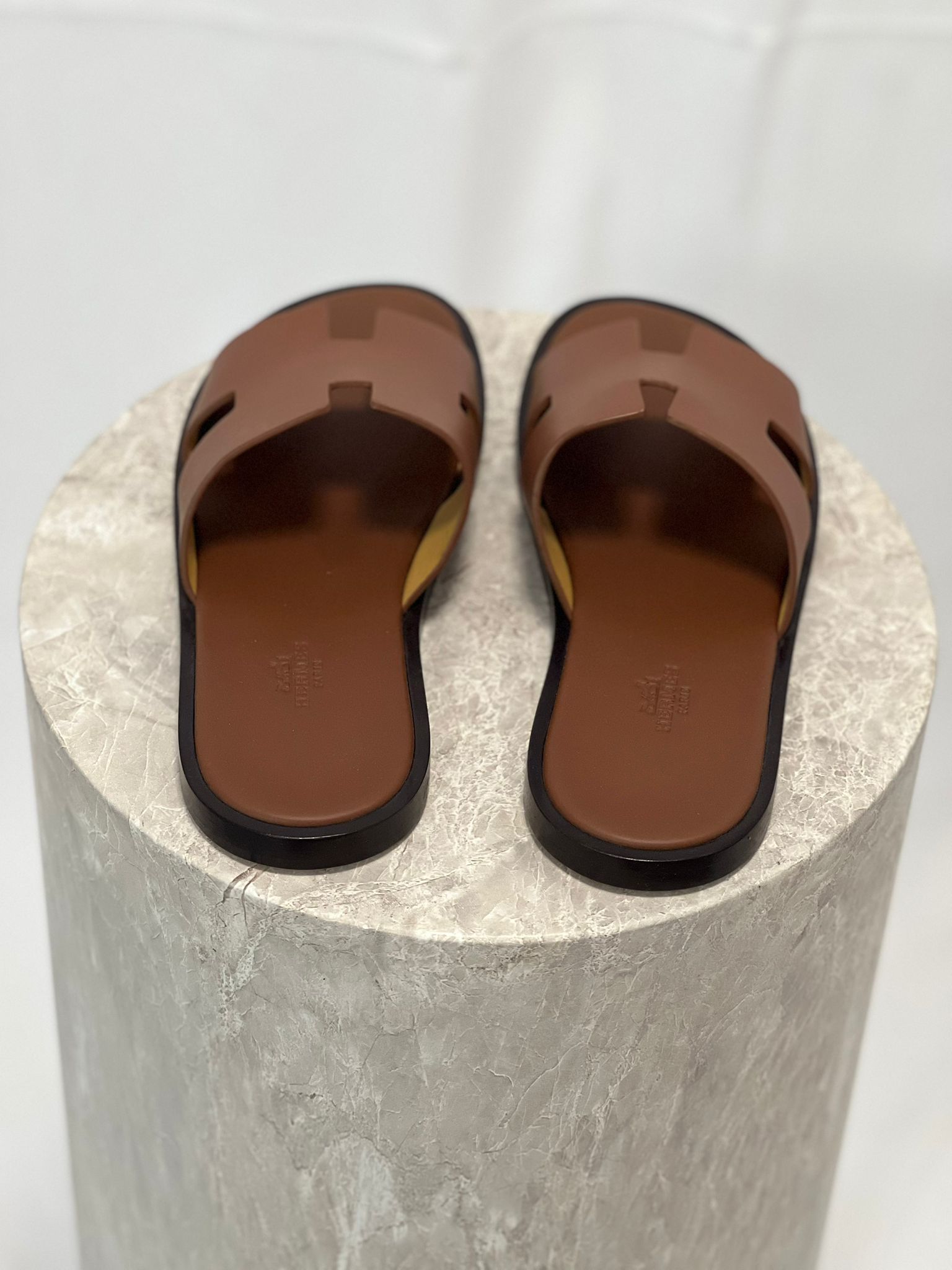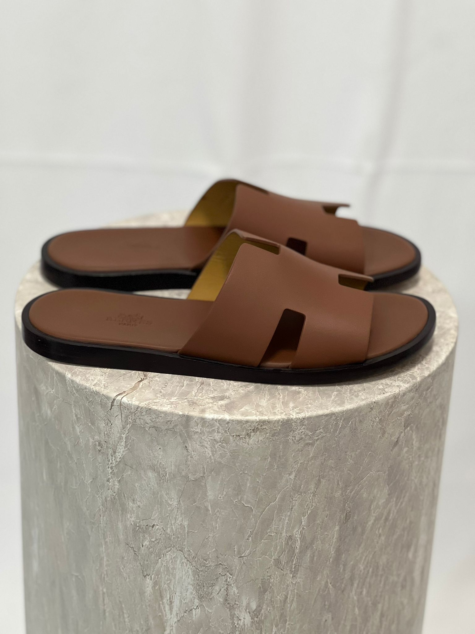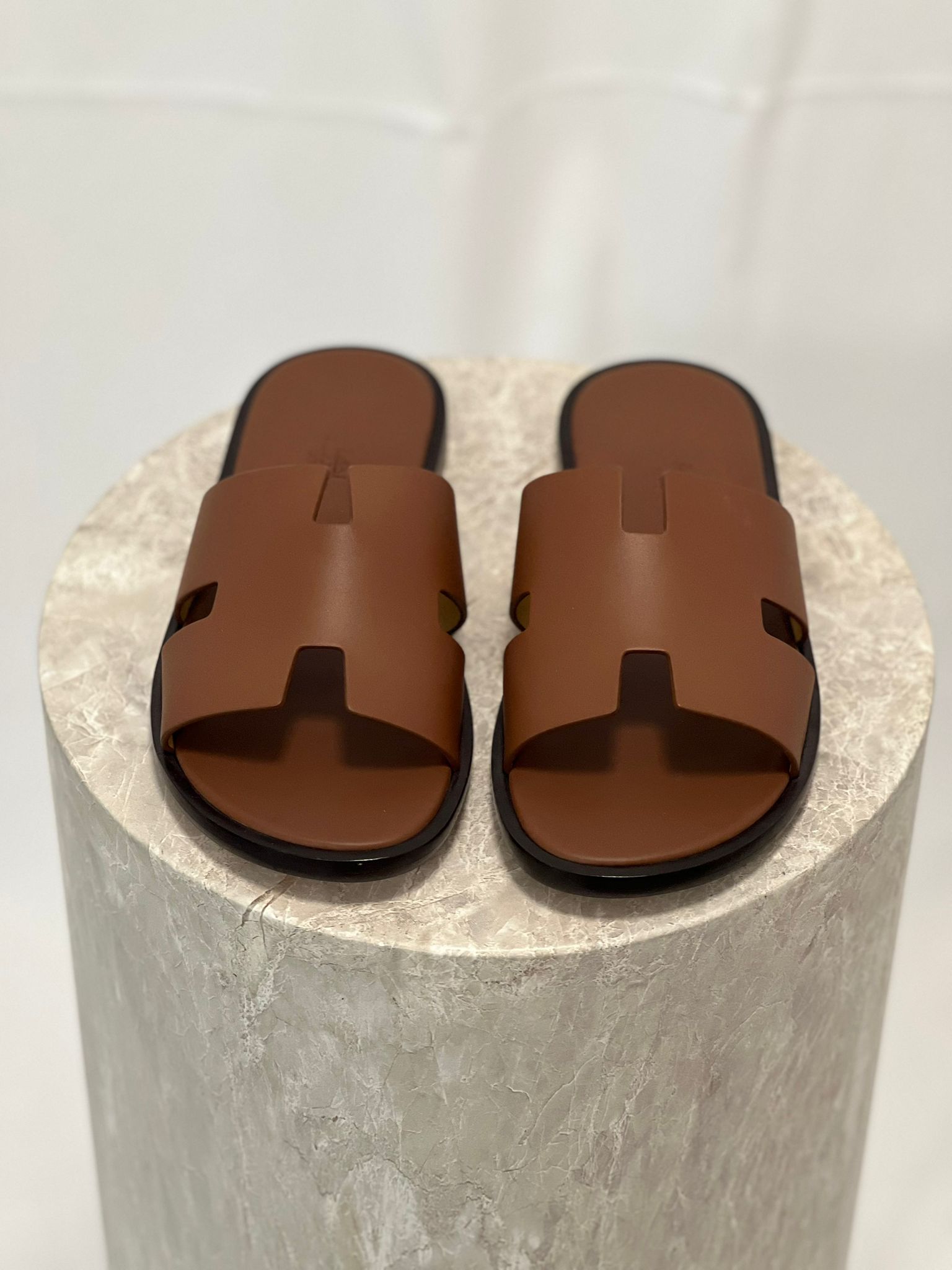- Crafted in smooth leather with the signature “H” cut-out, the Hermès Izmir sandals combine timeless elegance with everyday comfort.