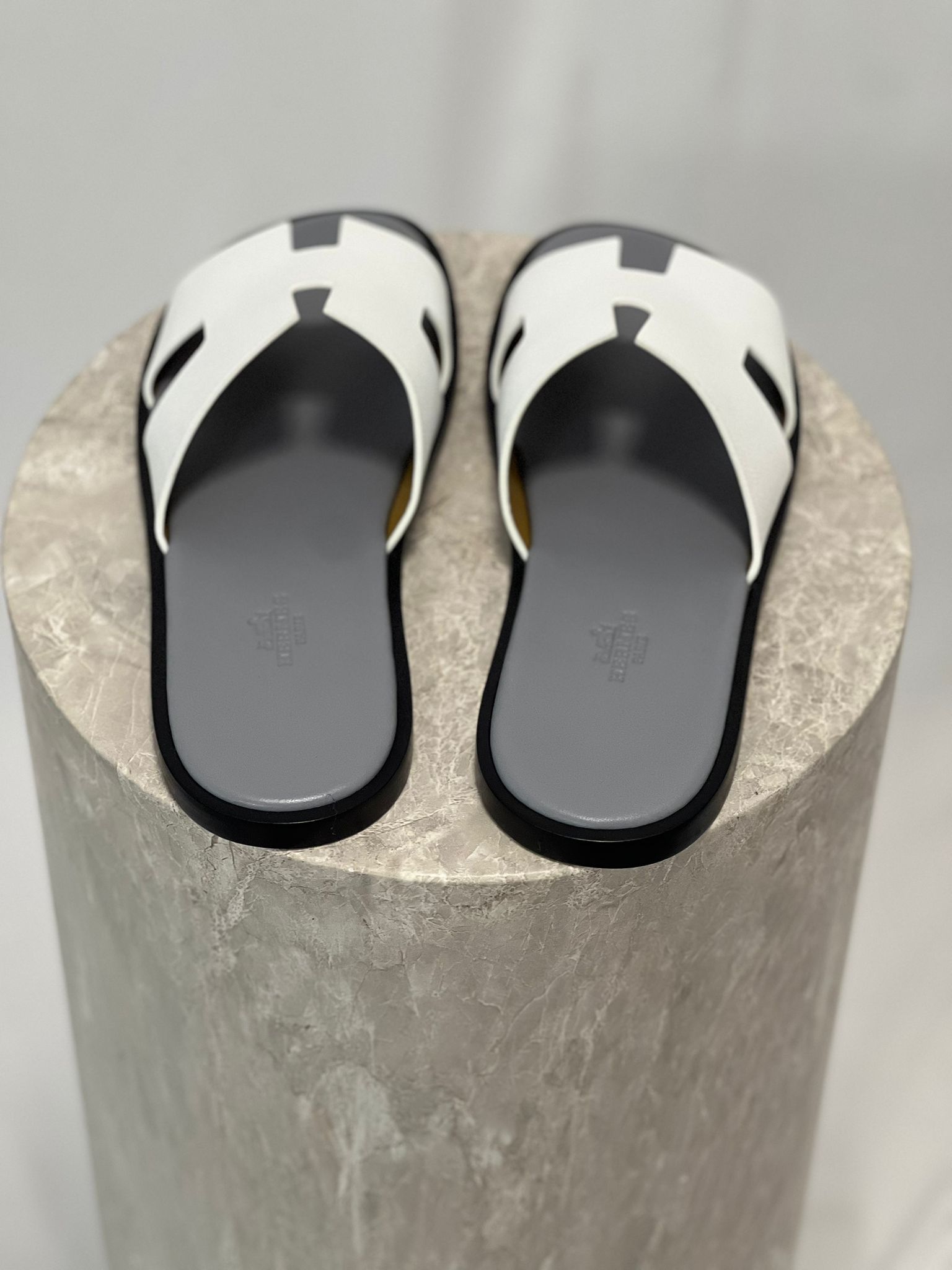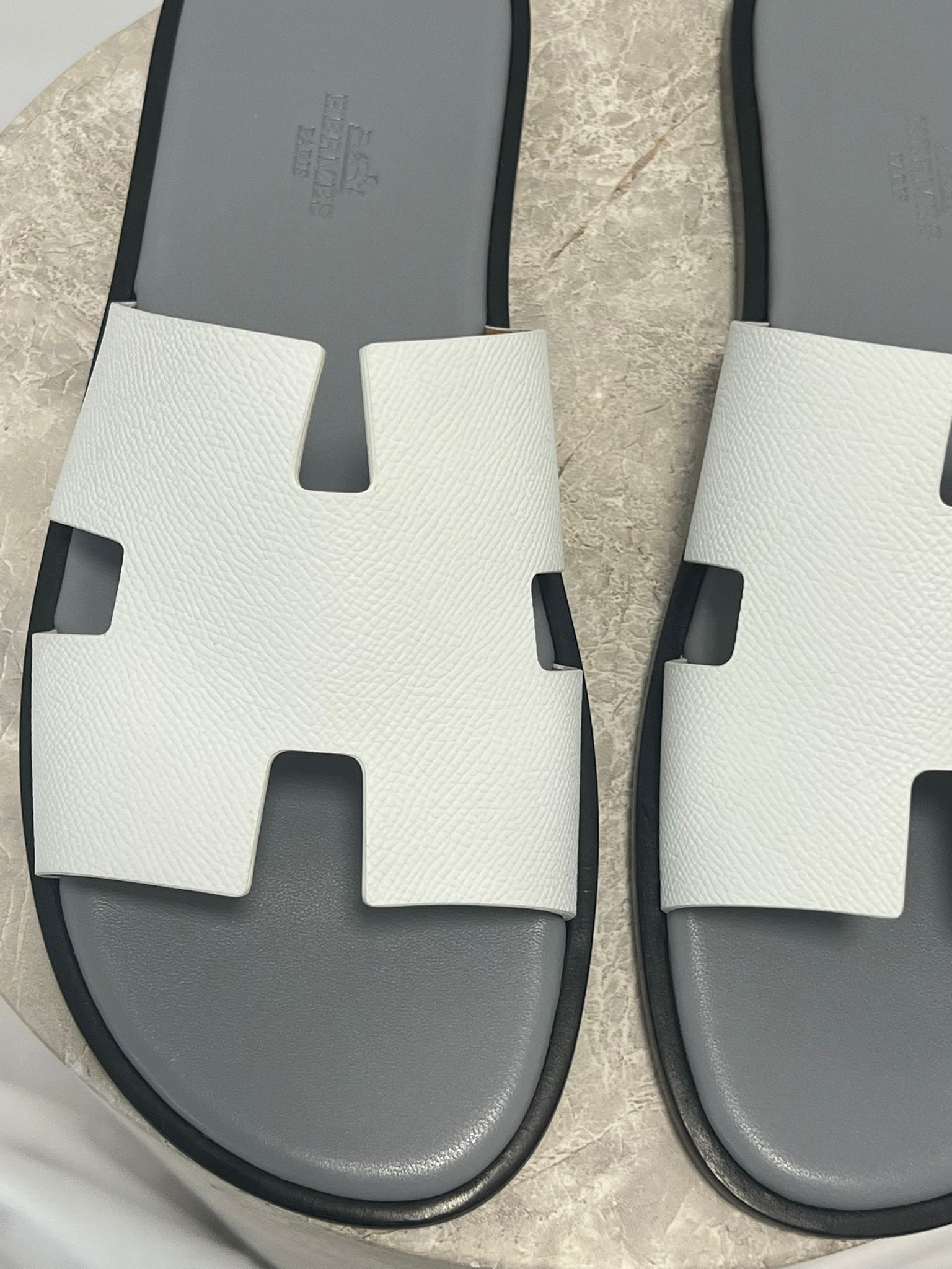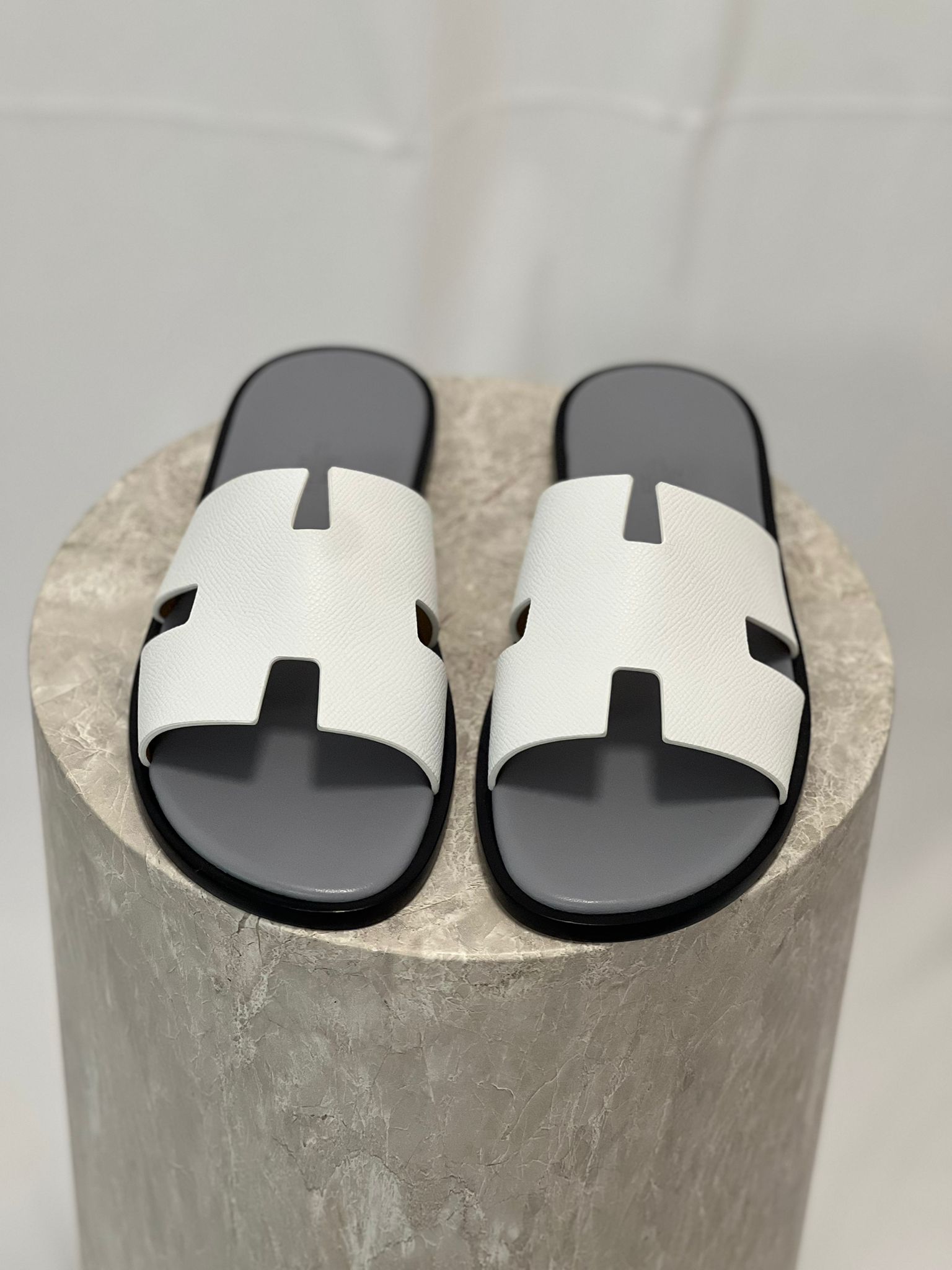 - Crafted in smooth leather with the signature “H” cut-out, the Hermès Izmir sandals combine timeless elegance with everyday comfort.