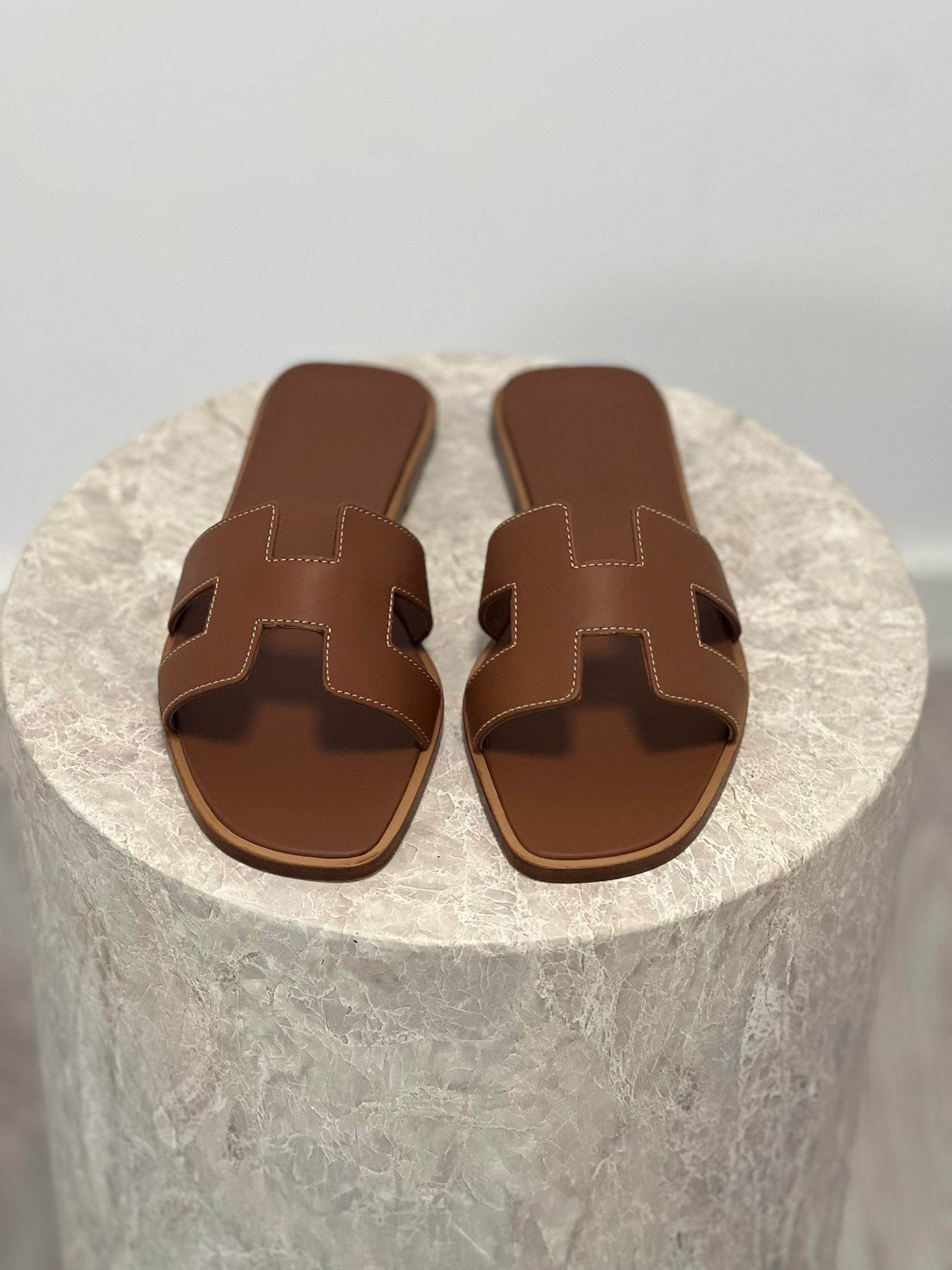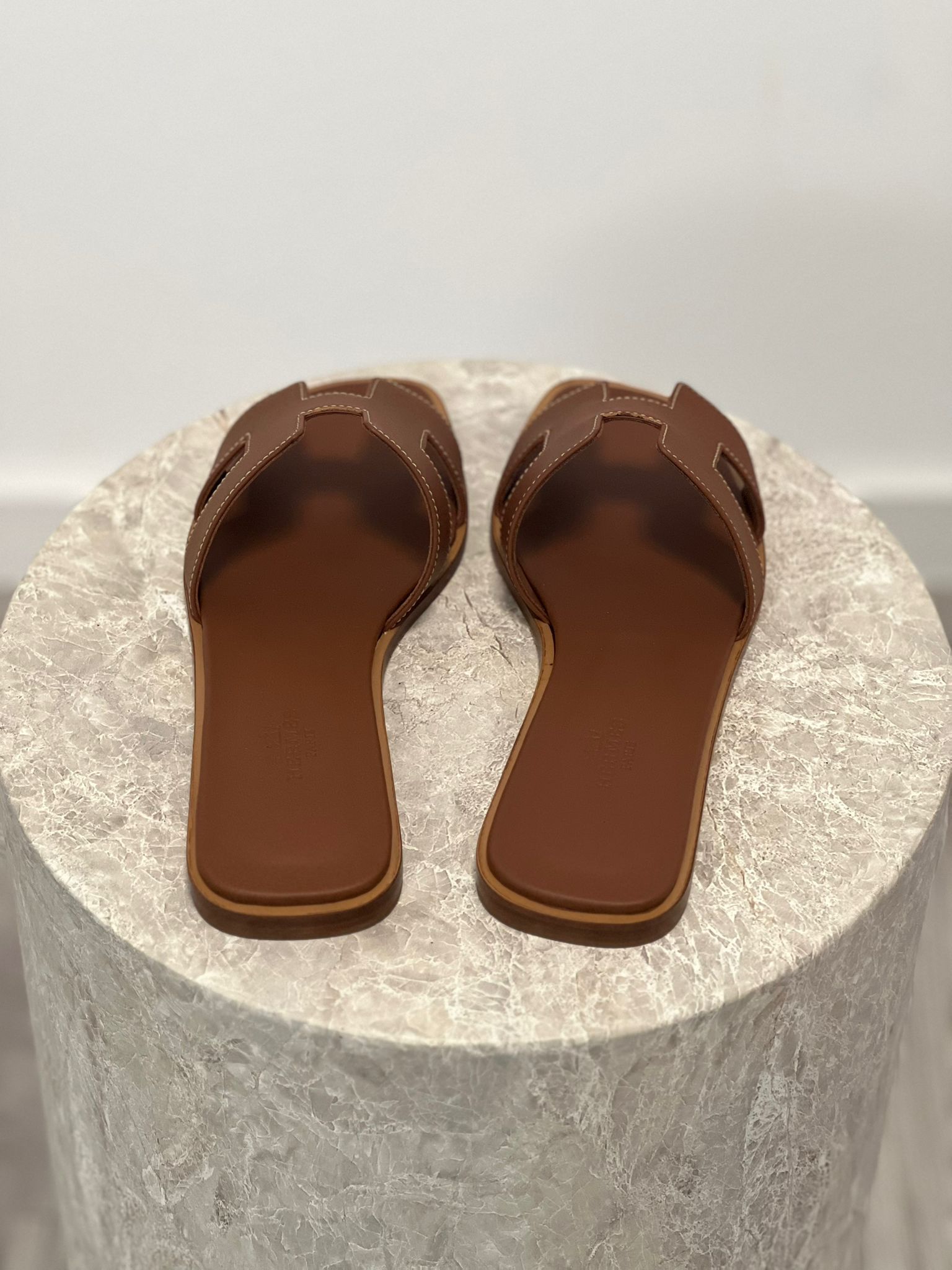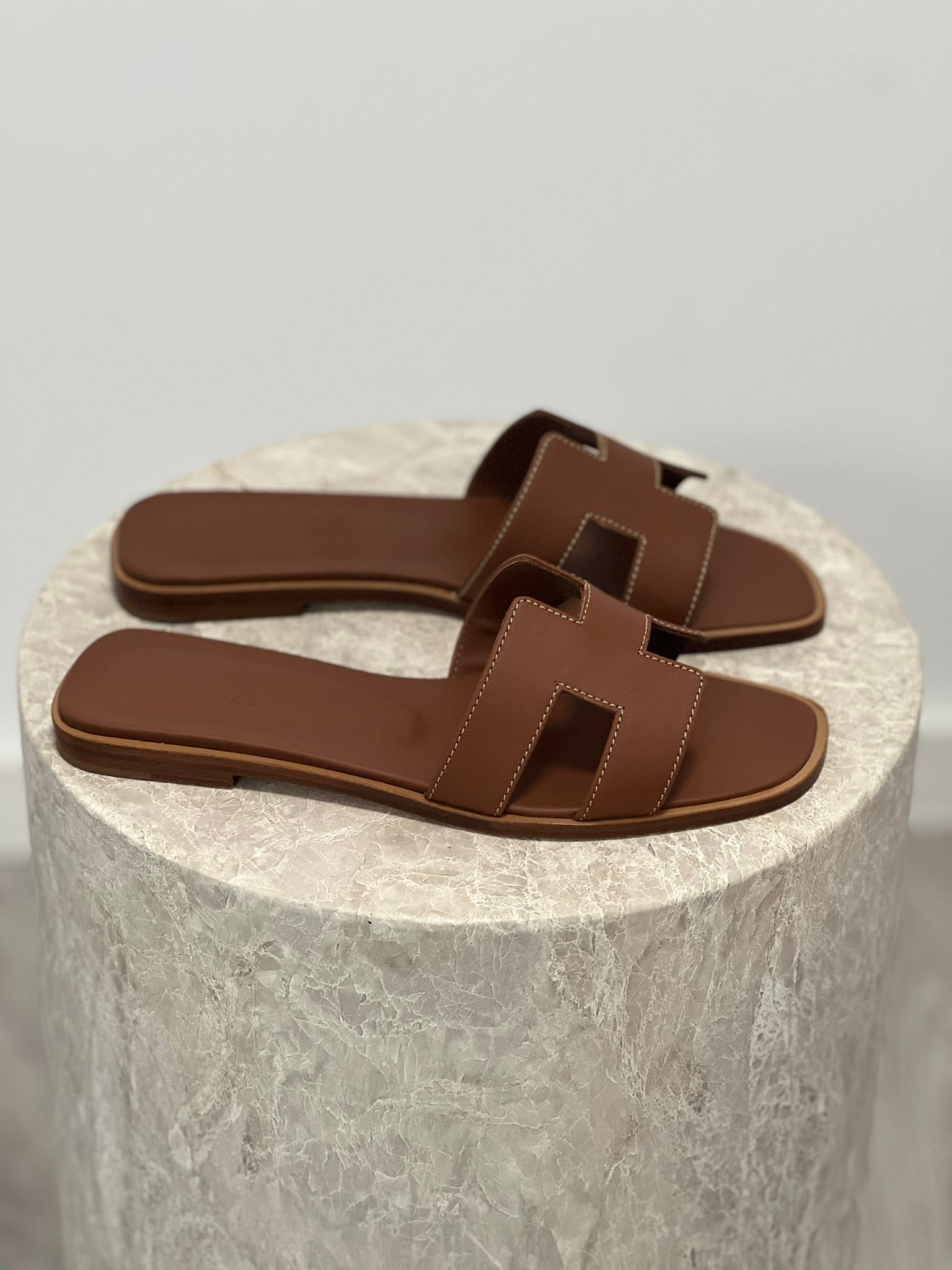 - The Hermès Oran sandals are crafted from premium leather and feature the iconic “H” cut-out design.