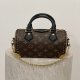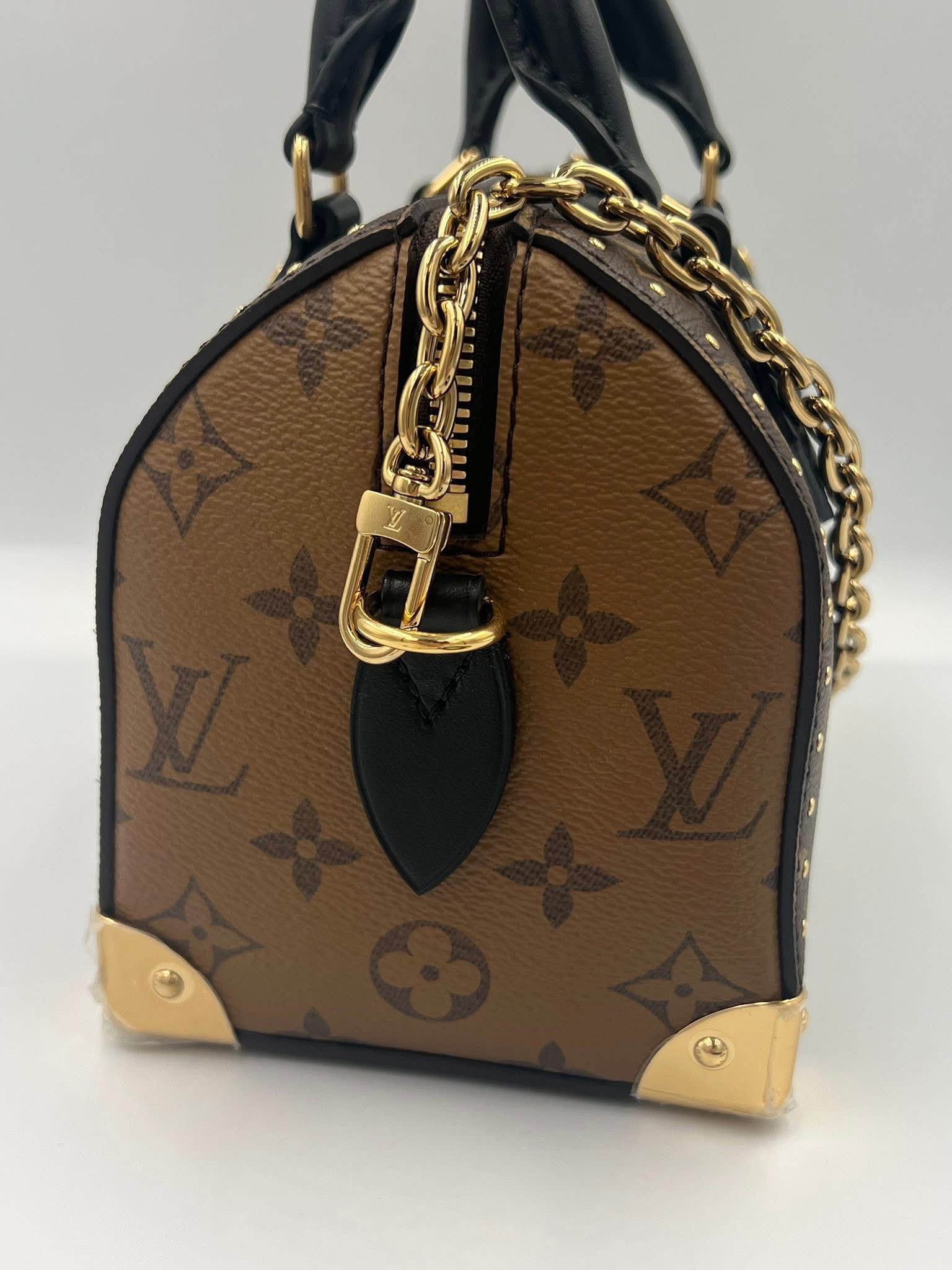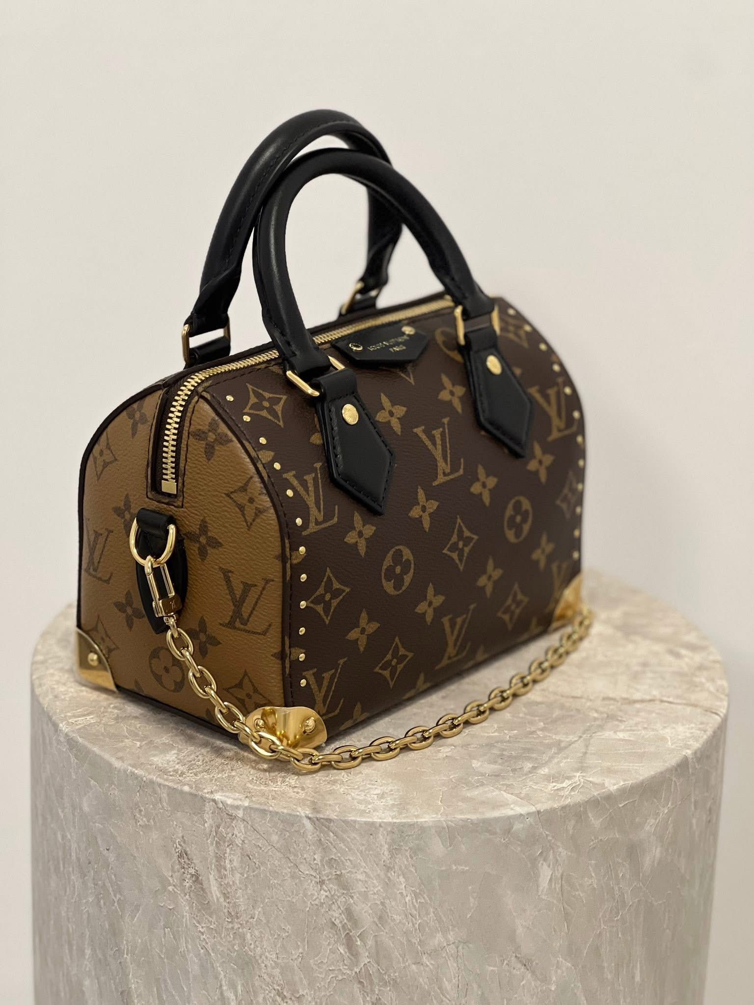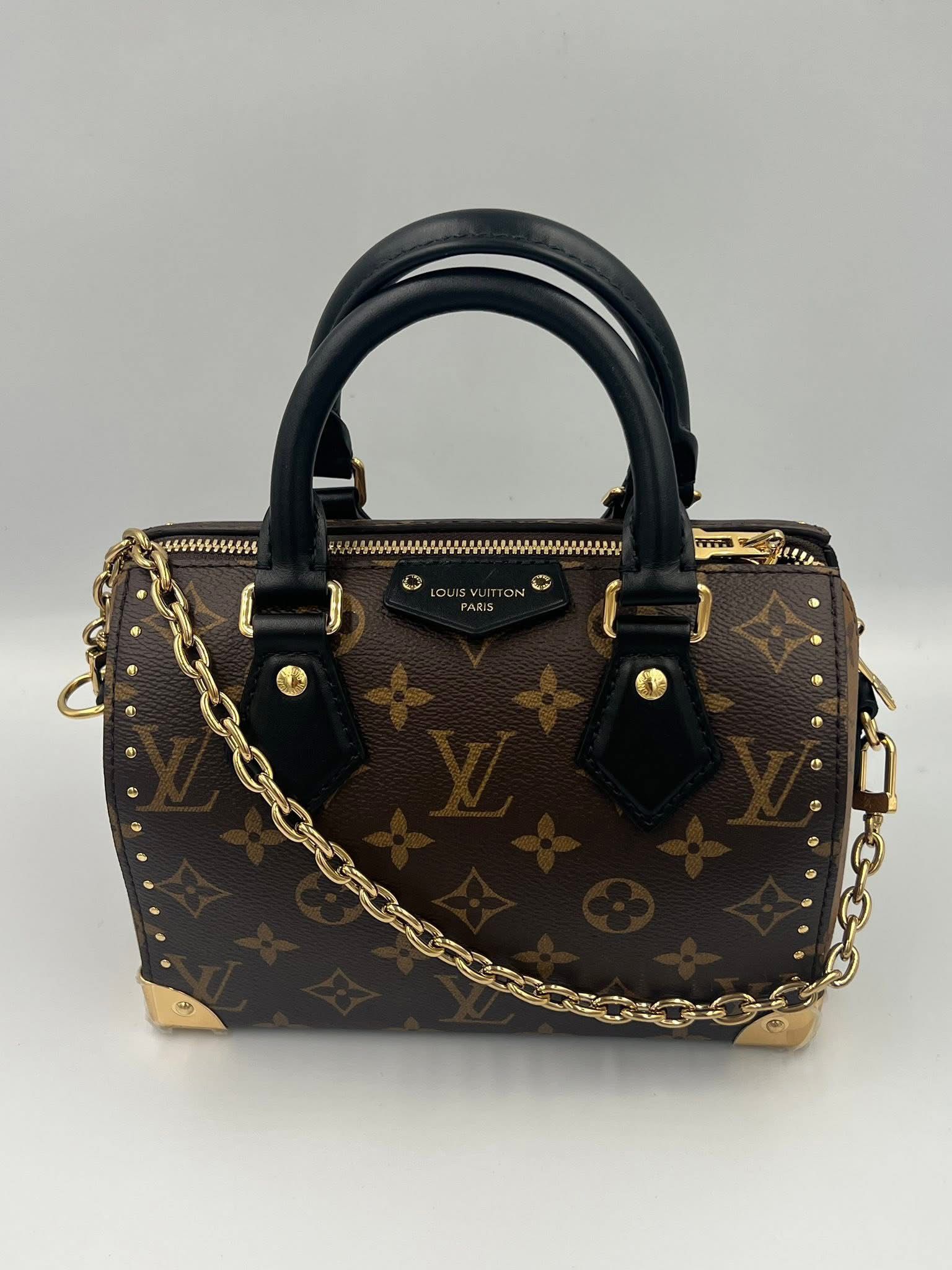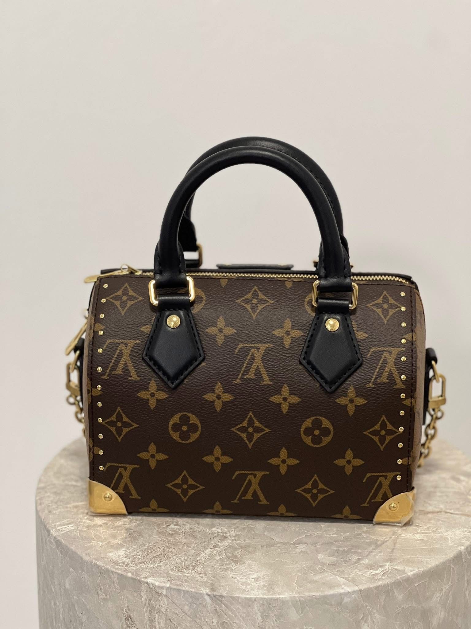 Can be carried by hand with the rolled leather top handles, or cross-body thanks to the removable chain strap.