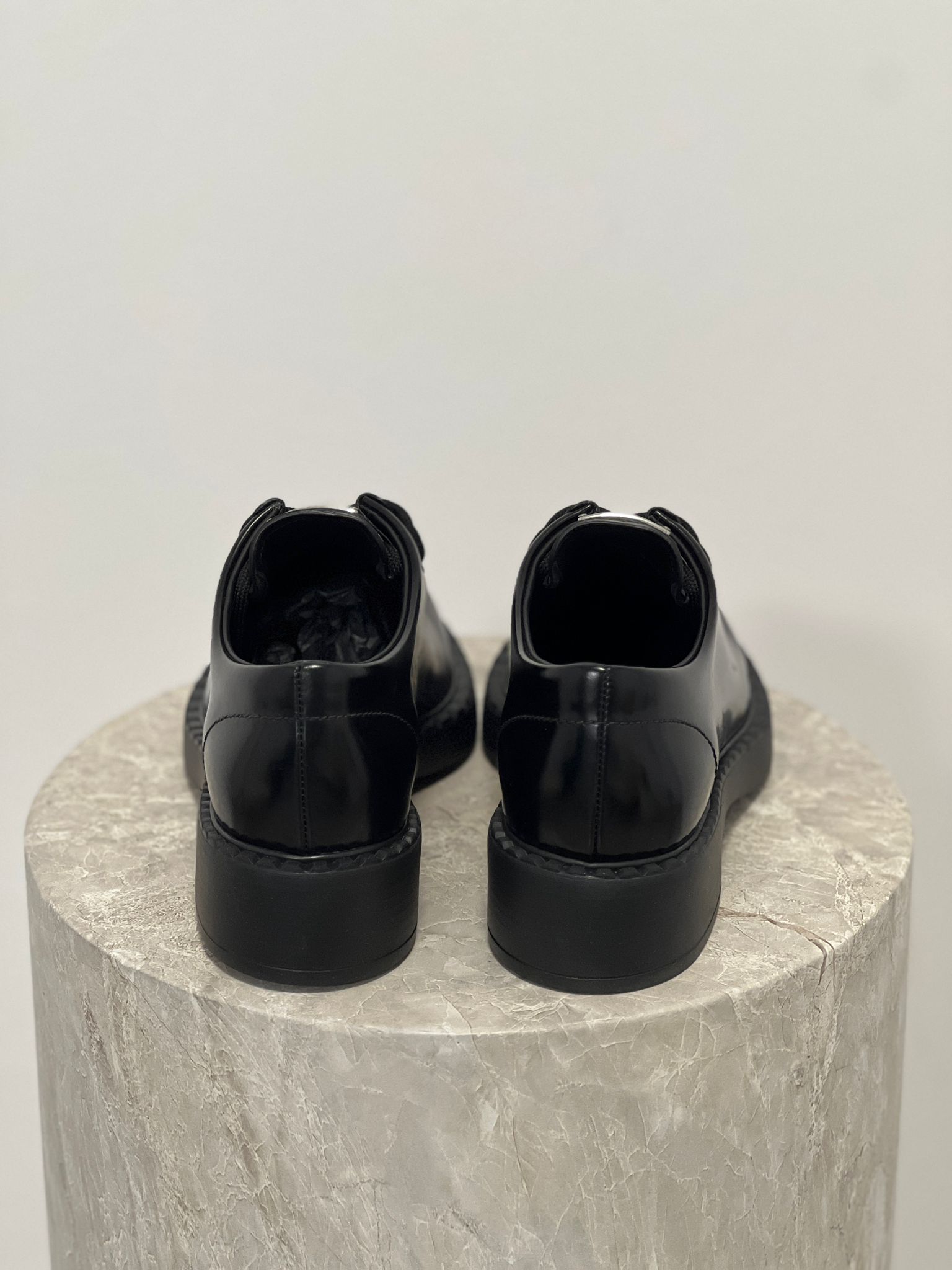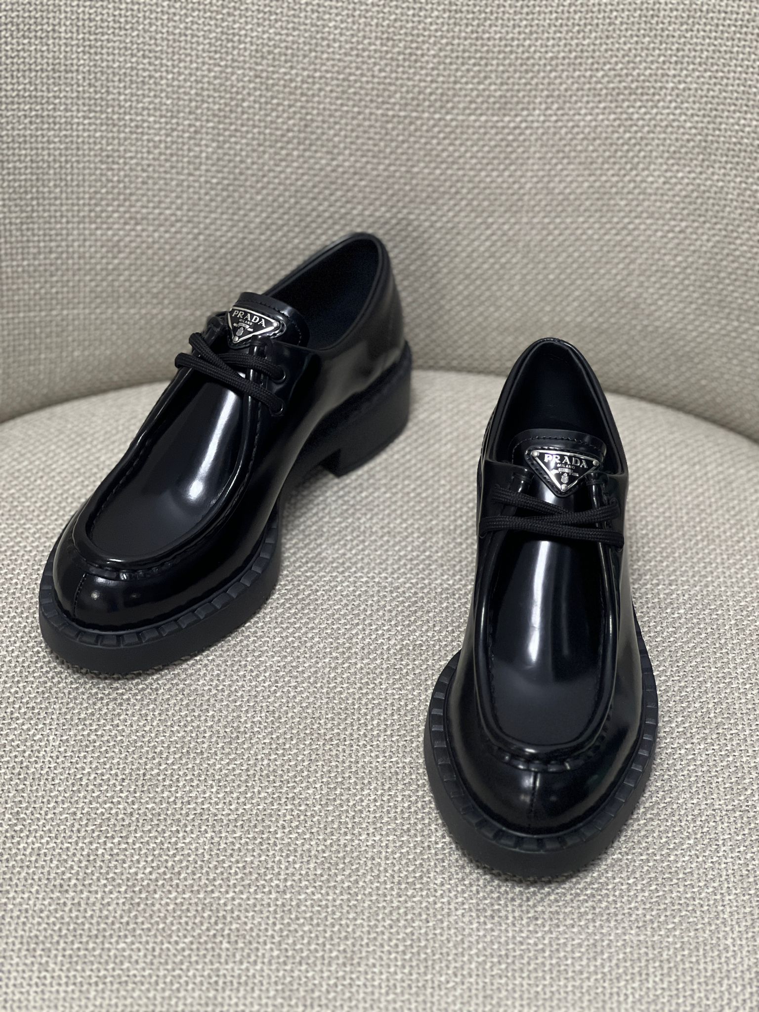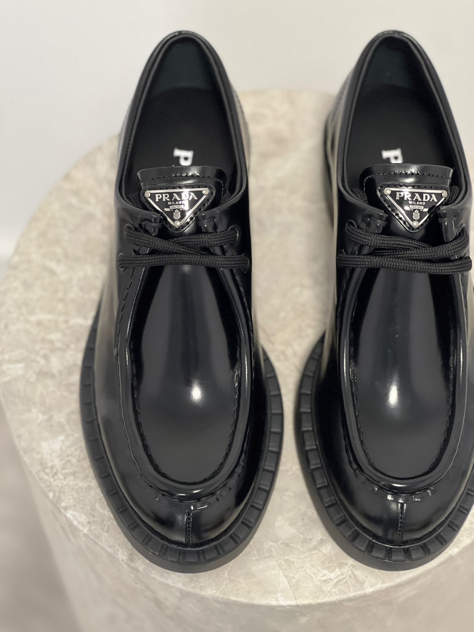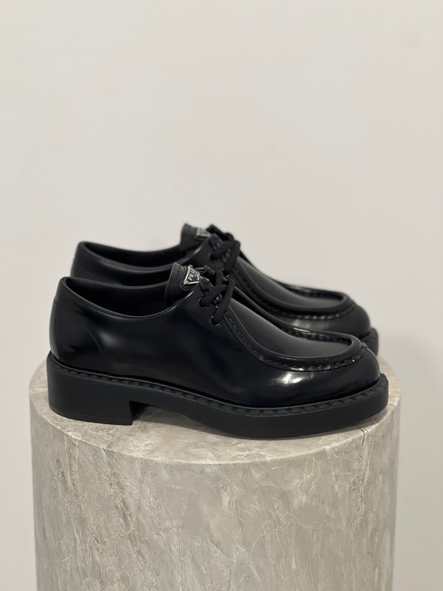 - Classic lace-up design in luxurious black calfskin leather. Polished finish with subtle Prada logo. Timeless, versatile style for smart-casual or formal looks.