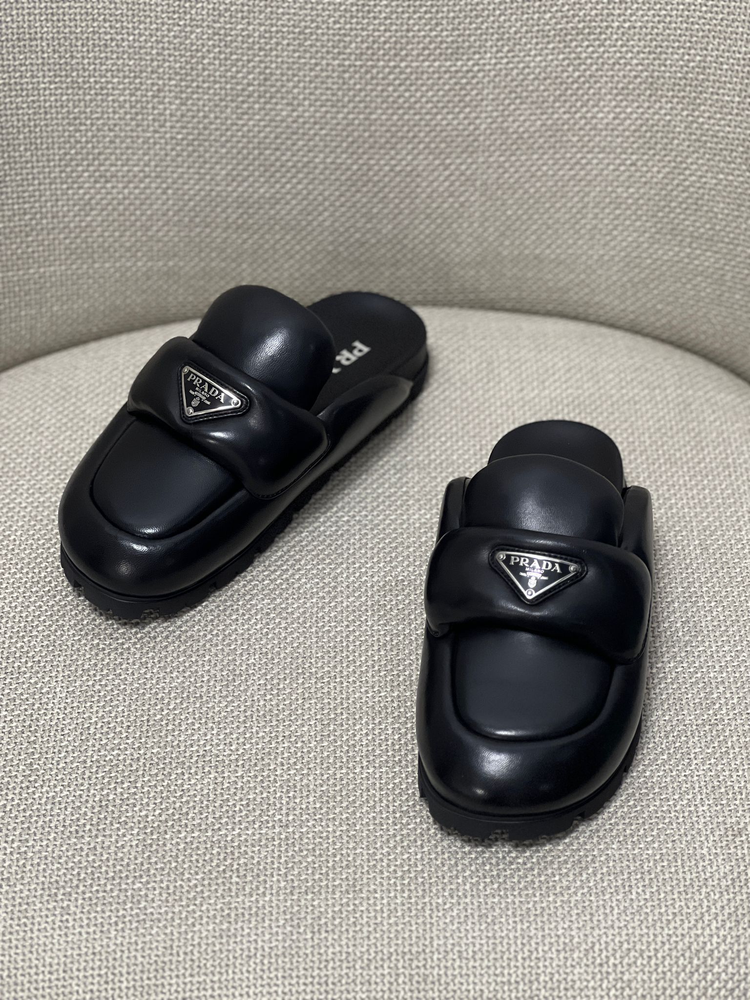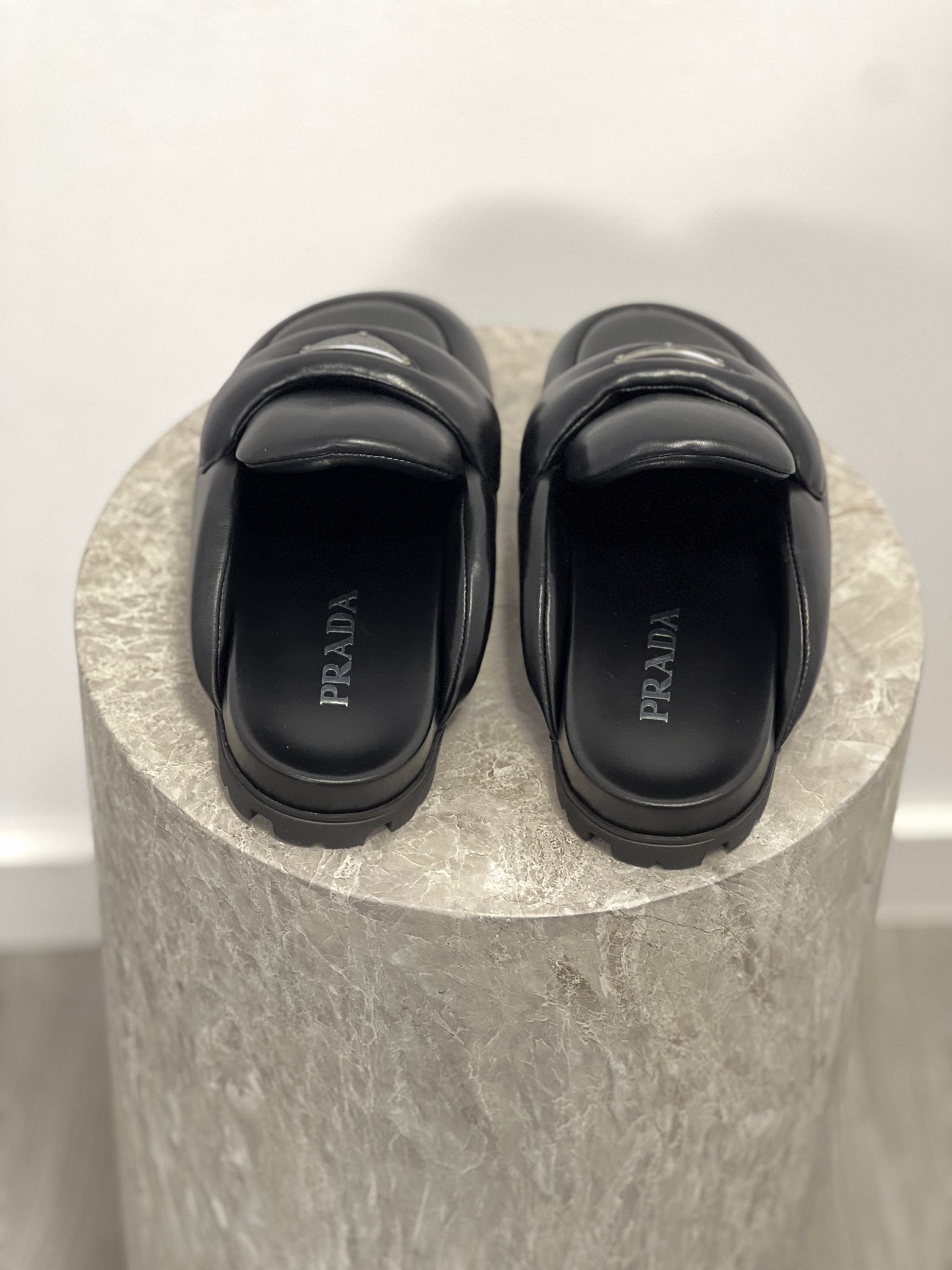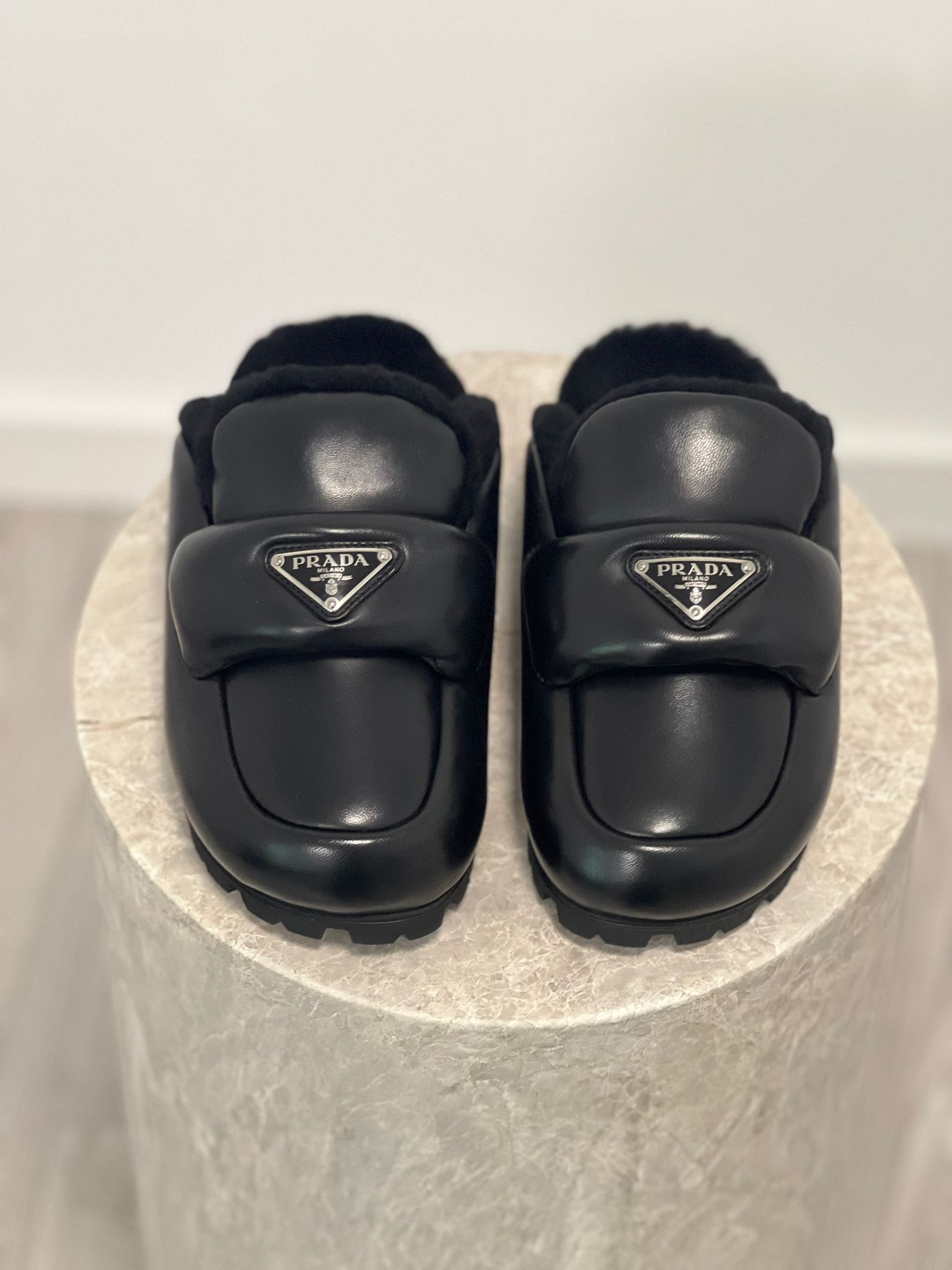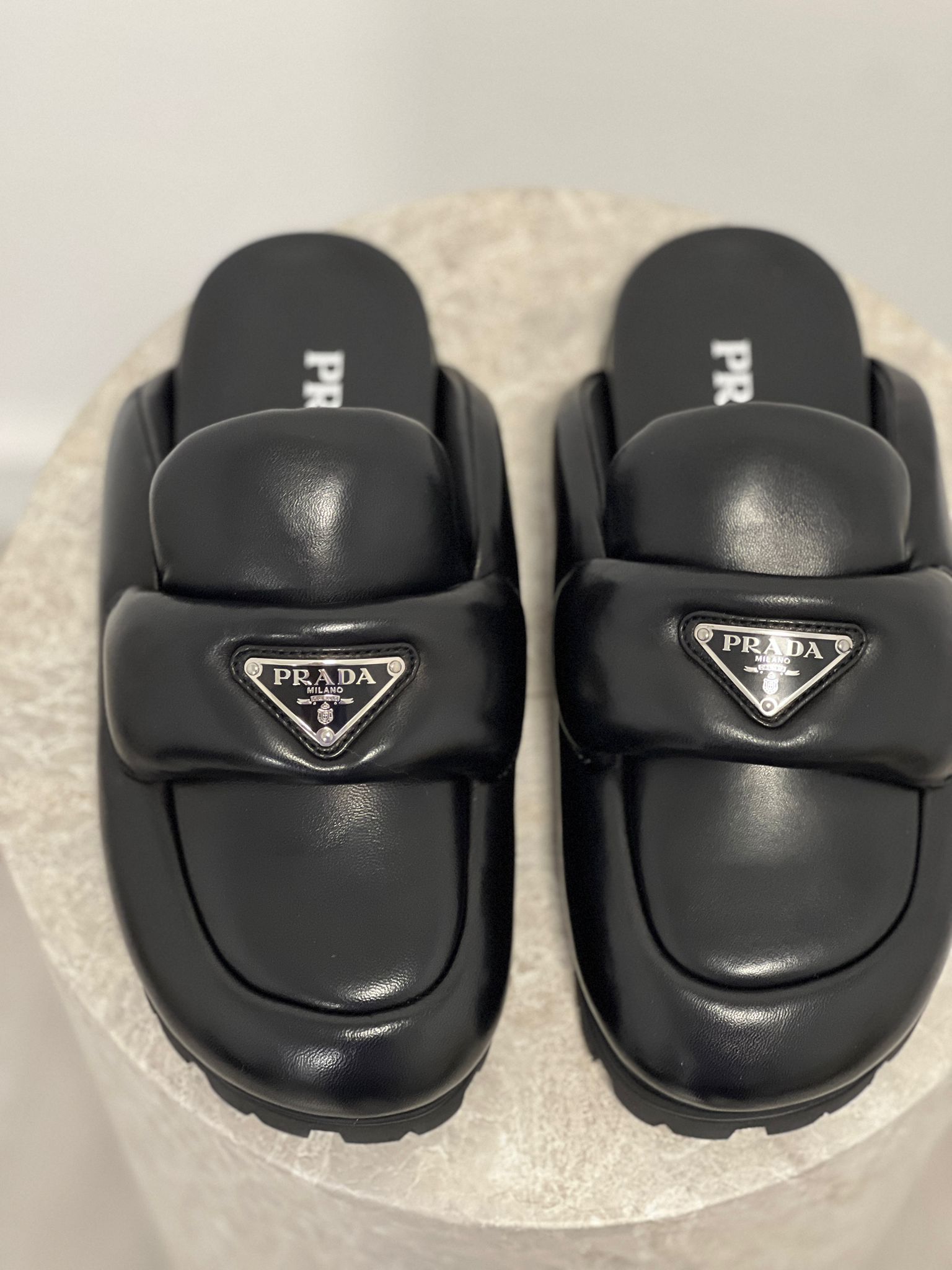 - Prada black leather mules with iconic logo and chunky sole – a perfect mix of comfort, premium materials, and Italian luxury.