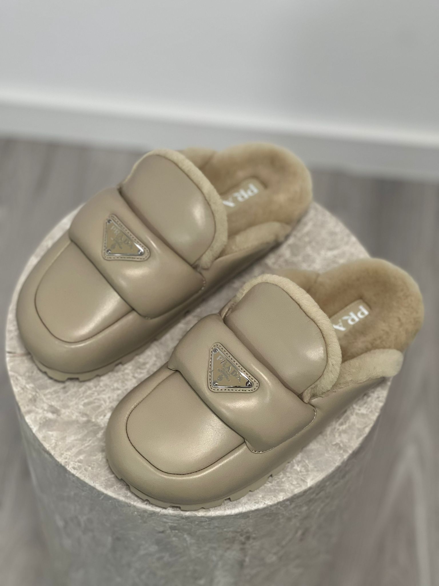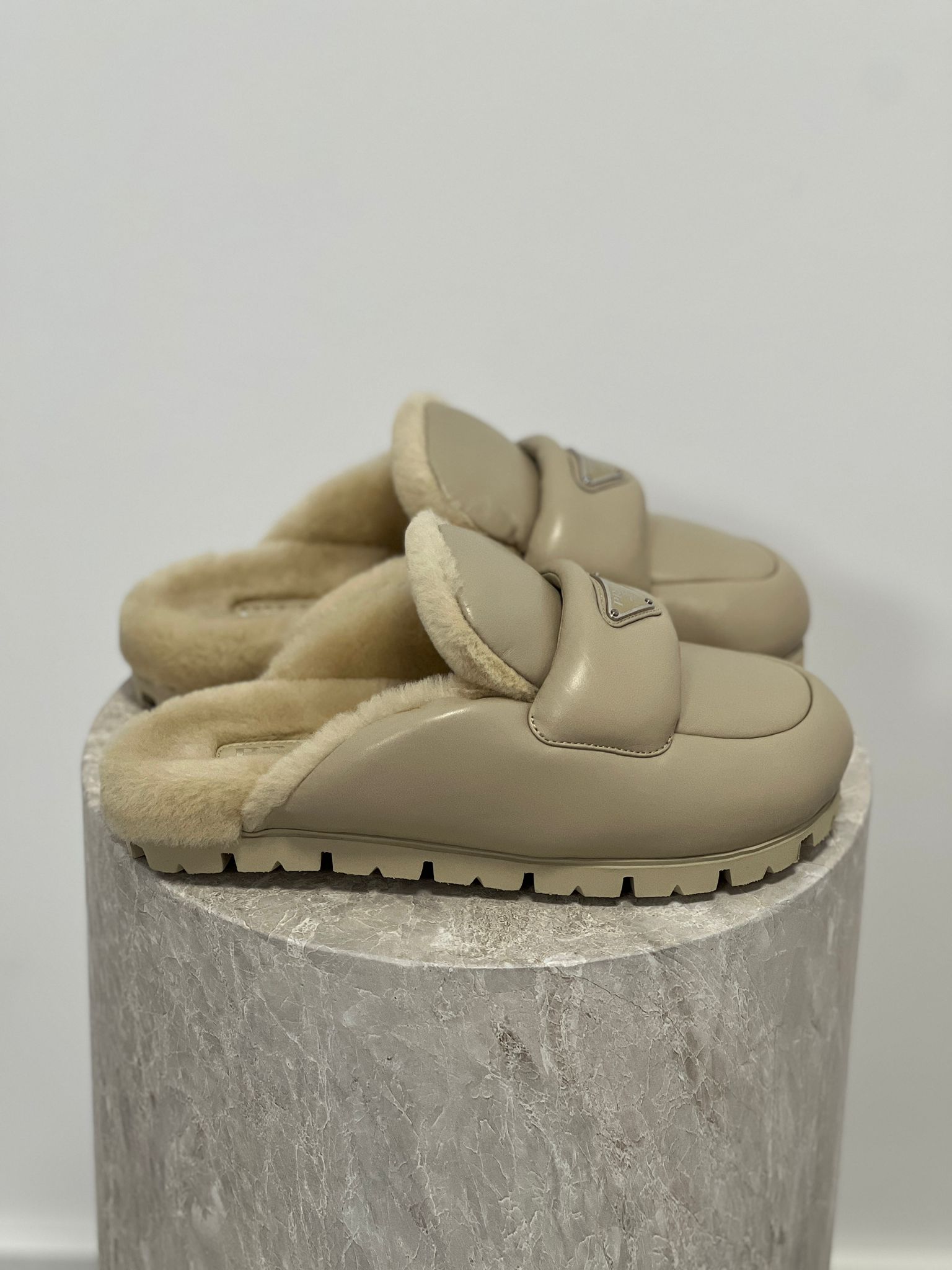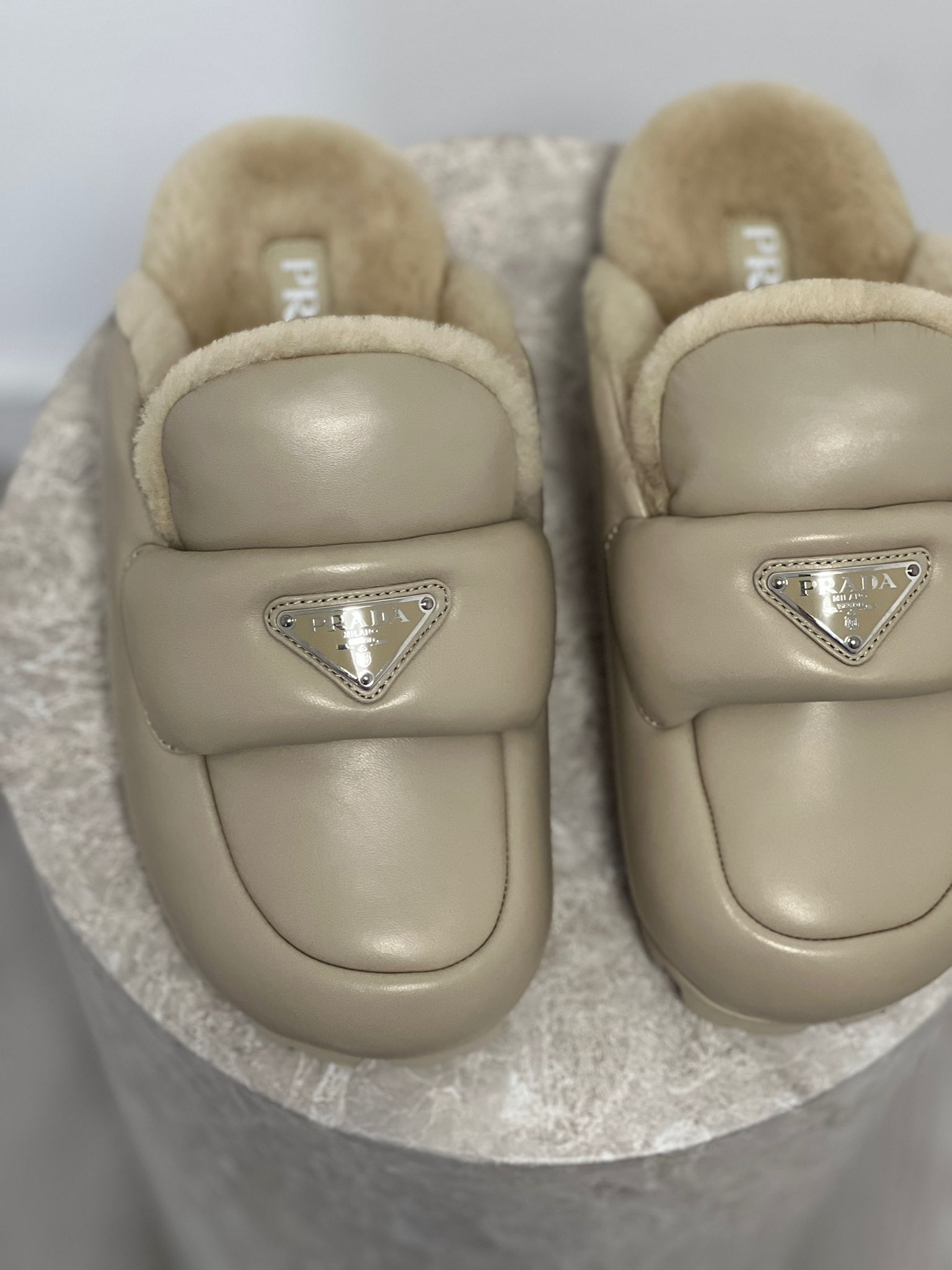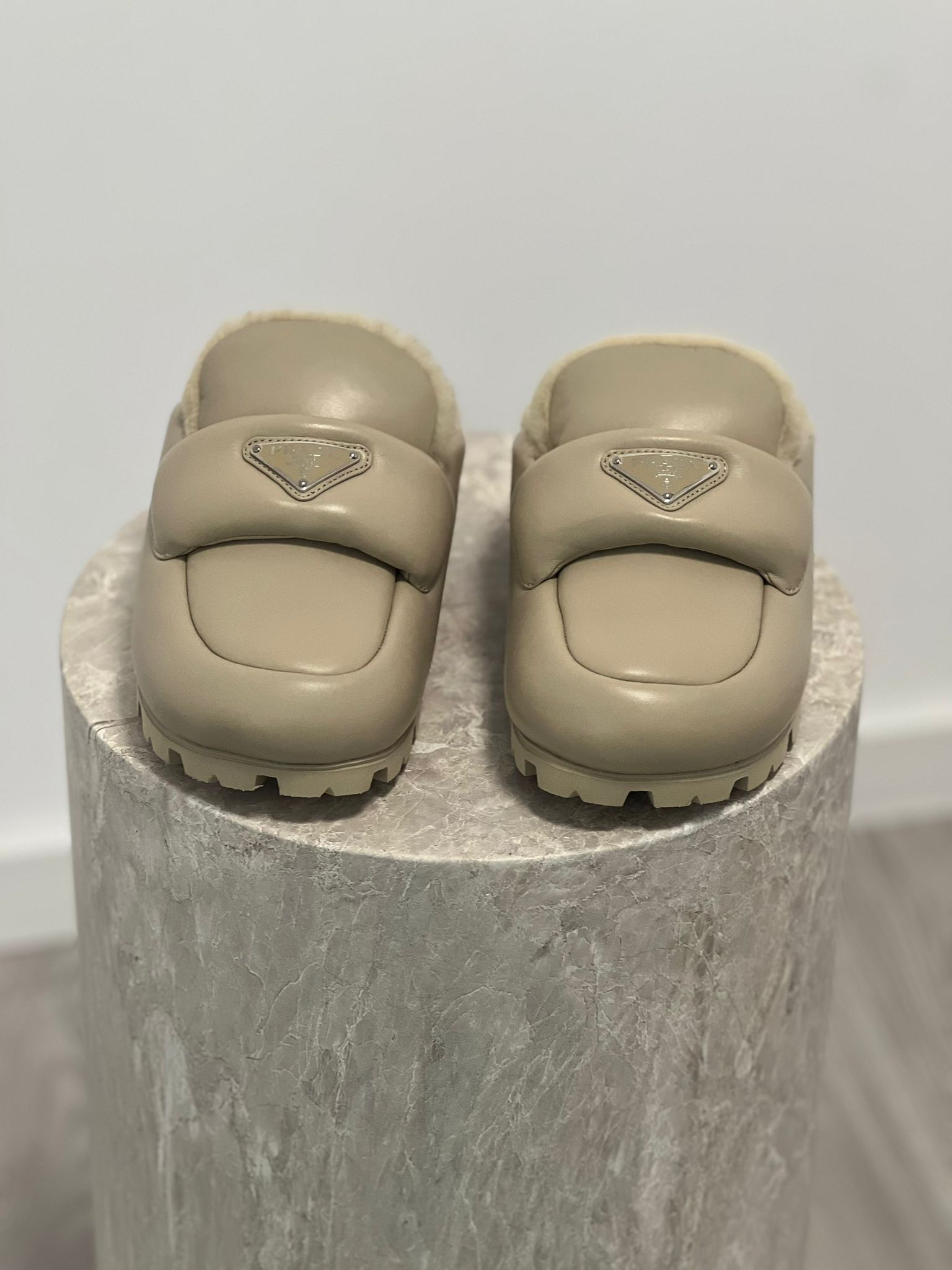 - Prada beige leather mules with shearling interior and chunky sole – stylish, comfortable, and crafted from premium materials.