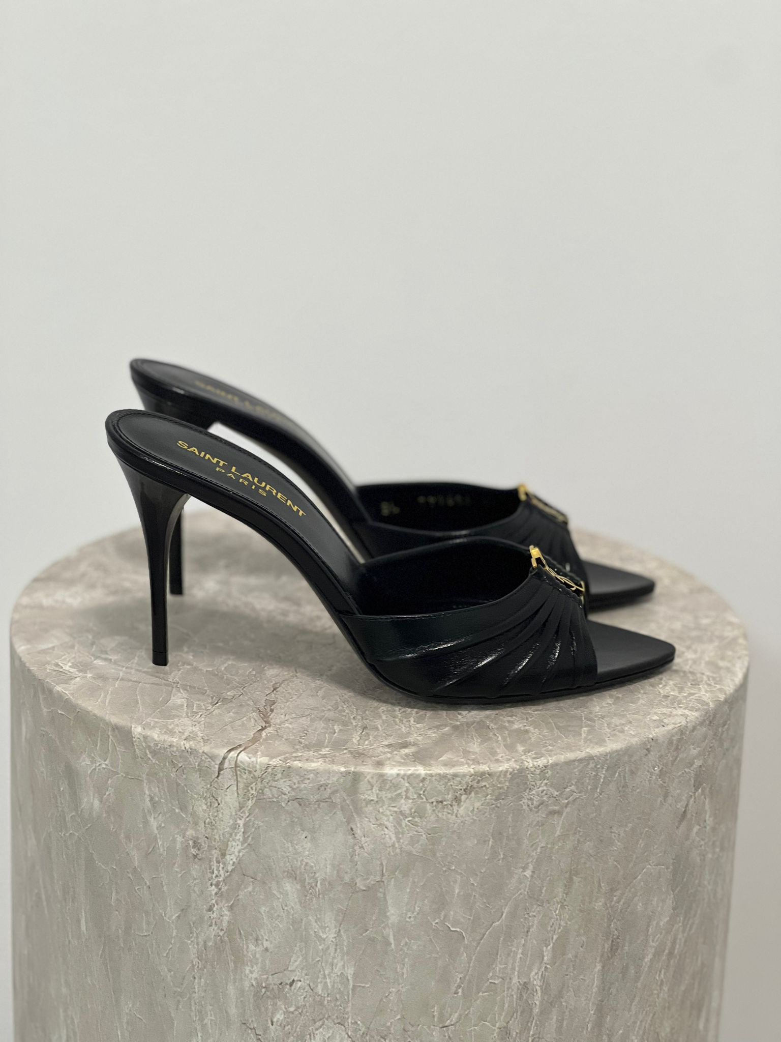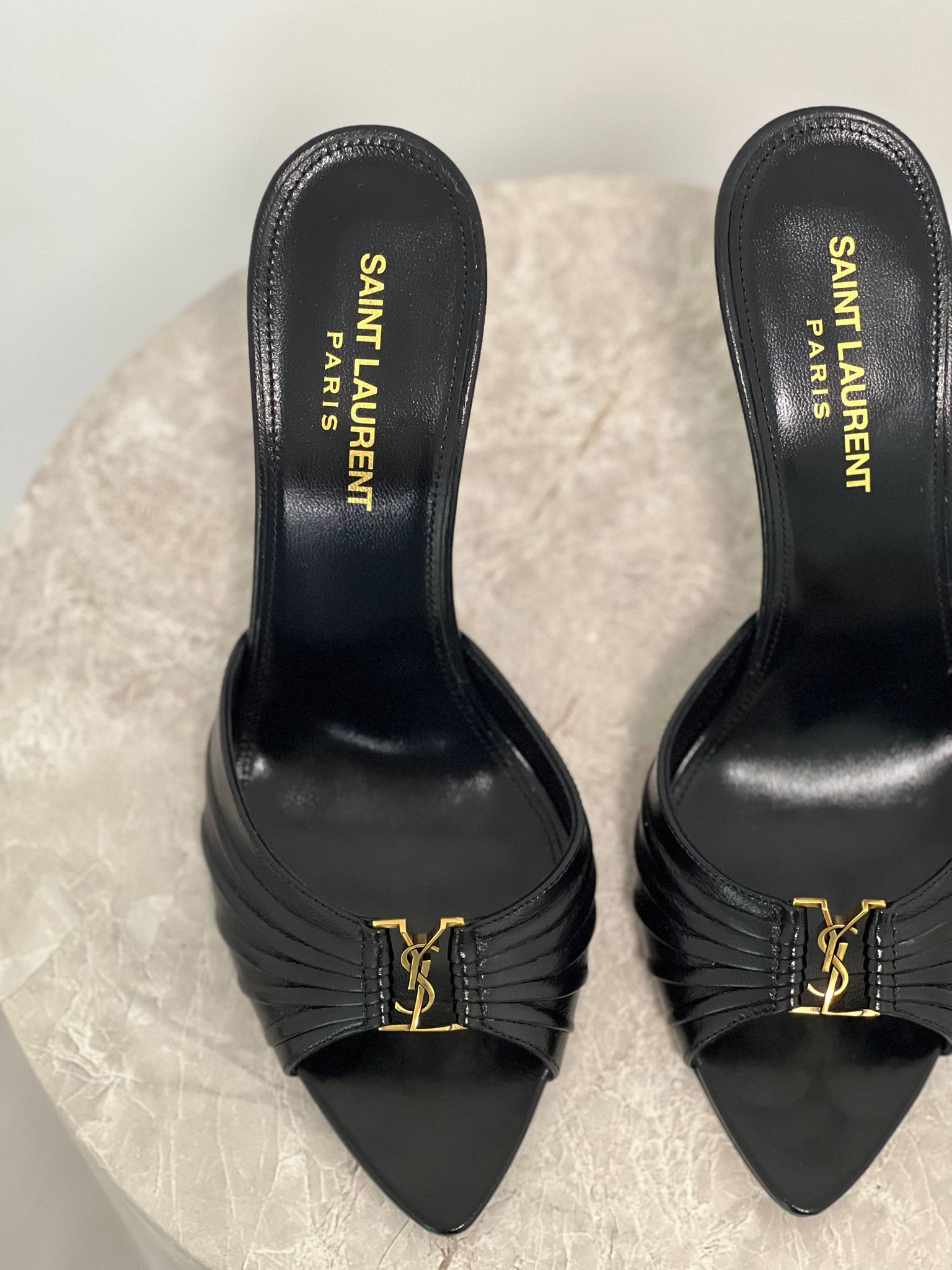 - Saint Laurent Babylone Mules in black leather, featuring a pointed toe, ruched front design, and the signature YSL gold-tone monogram. Elegant and versatile, perfect for day-to-night styling.