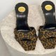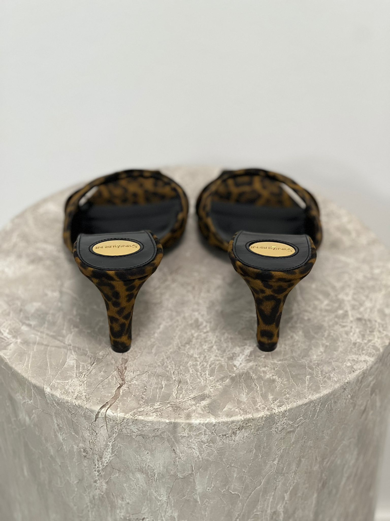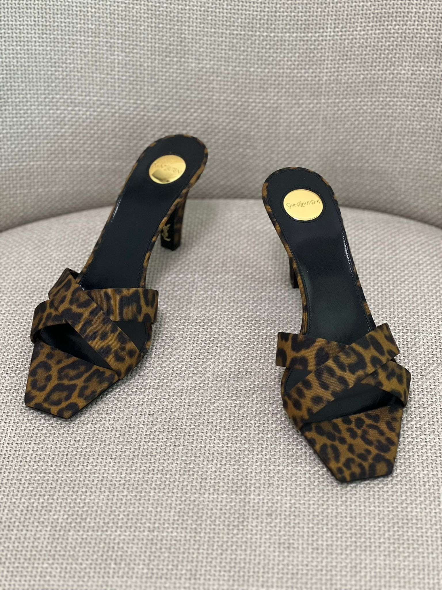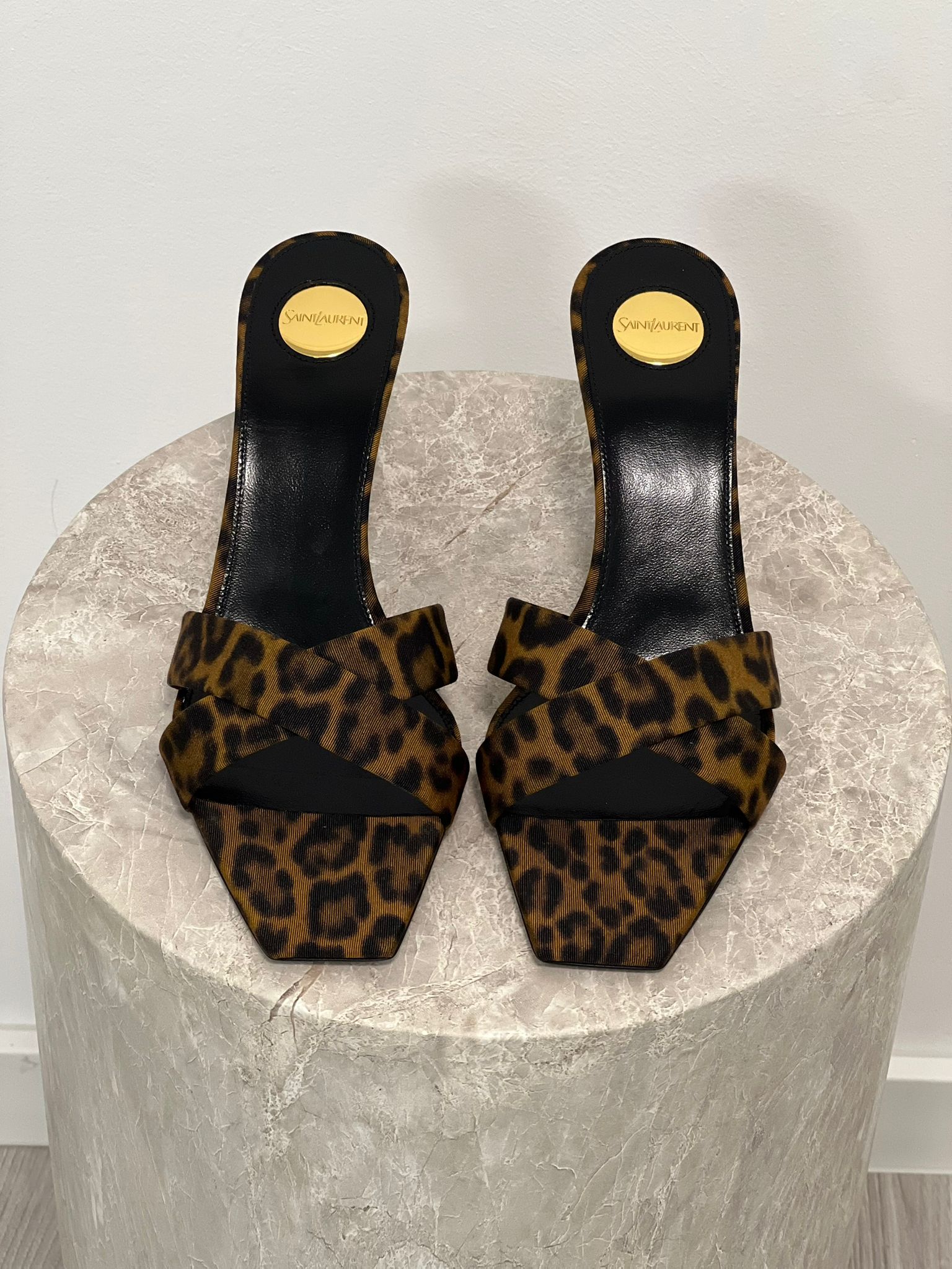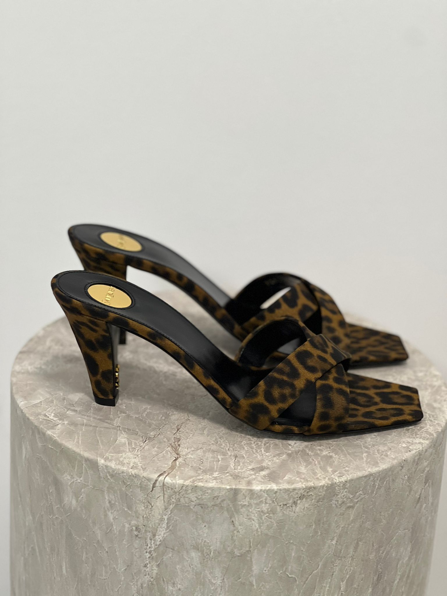 - Saint Laurent Jill sandals crafted in leopard-print fabric, featuring a square toe, crisscross straps, and a sleek slip-on design.