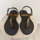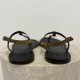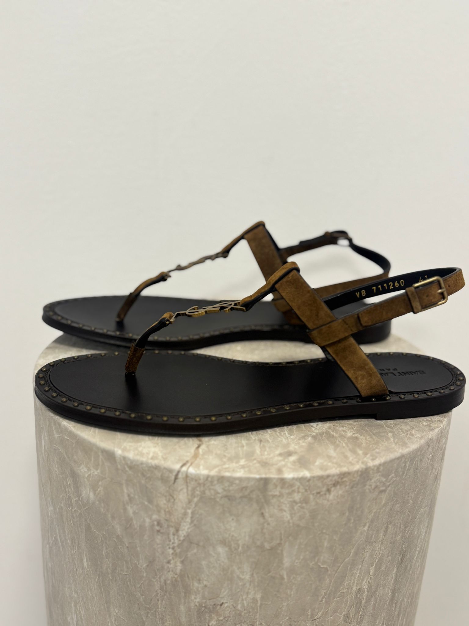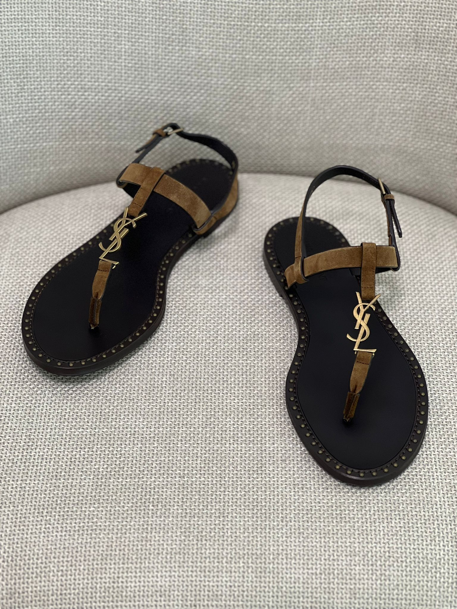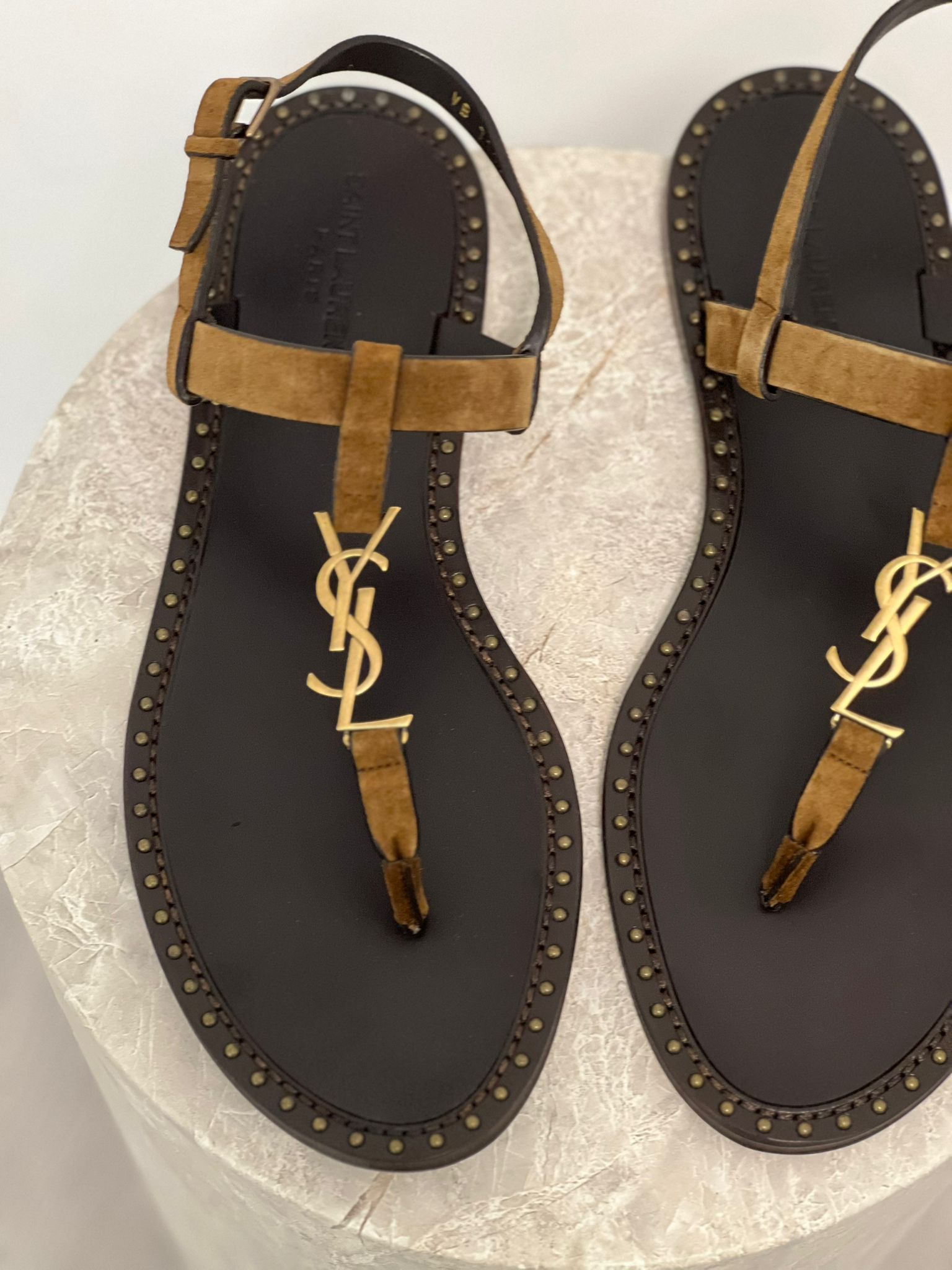 - Brown suede thong sandals featuring gold-tone YSL logo detail, adjustable ankle strap, leather sole with studded trim.